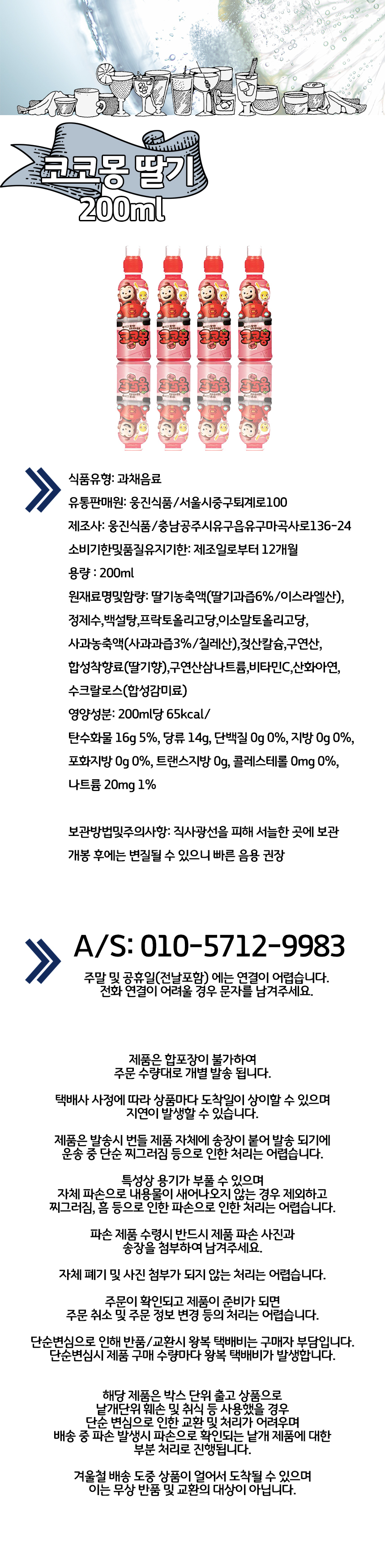 | 원재료 및 함량 | 딸기농축액(딸기과즙6%/이스라엘산),정제수,백설탕,프락토올리고당,이소말토올리고당,사과농축액(사과과즙3%/칠레산),젖산칼슘,구연산,합성착향료(딸기향),구연산삼나트륨,비타민C,산화아연,수크랄로스(합성감미료) |
