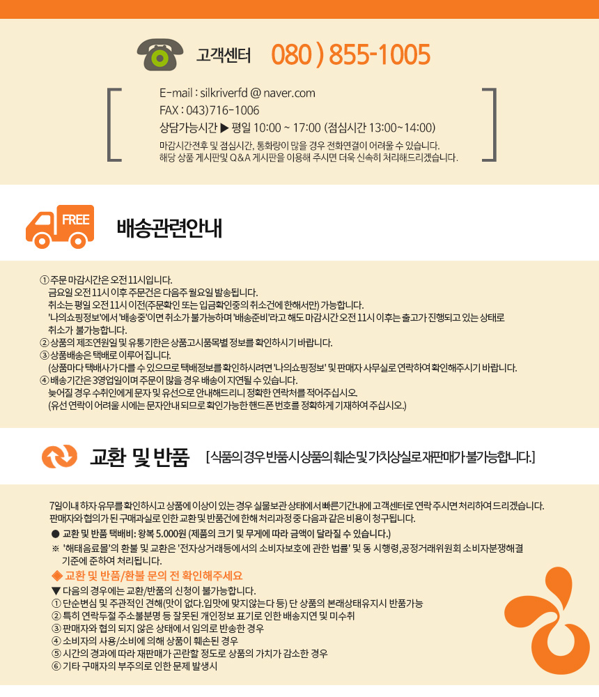 | 소비자상담 관련 전화번호 | 043-716-1005 교환 / 환불은 고객센터 통화 후 가능합니다. 단순변심은 고객님께서 왕복배송료를 부담해야 합니다. |
