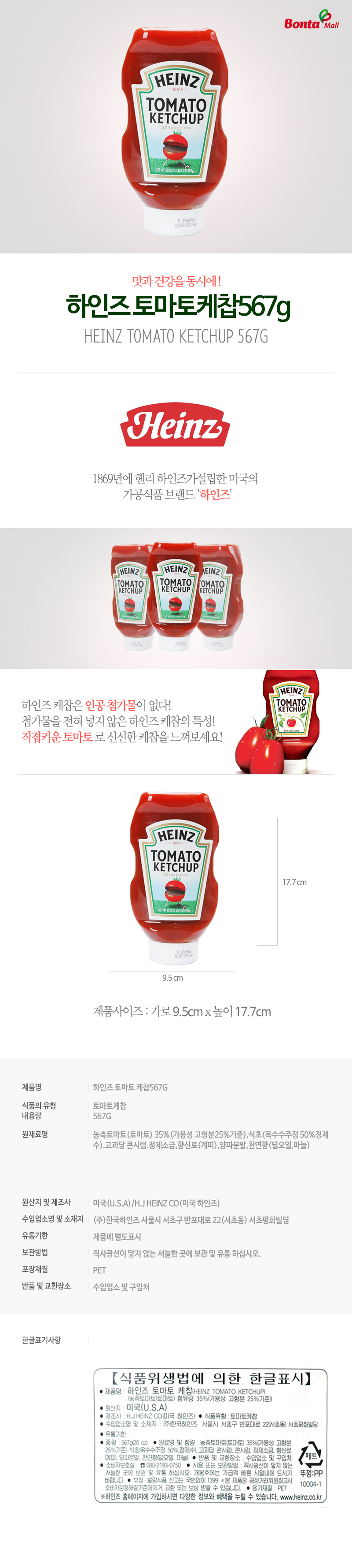| 원재료 및 함량 | 농축토마토(토마토)35% 외 농축토마토(토마토)35%(가용성고형분25%기준),식초(옥수수주정50%정제수),고과당 콘시럽,정제소금,향신료(계피),양파분말,천연향(딜오일,마늘) |