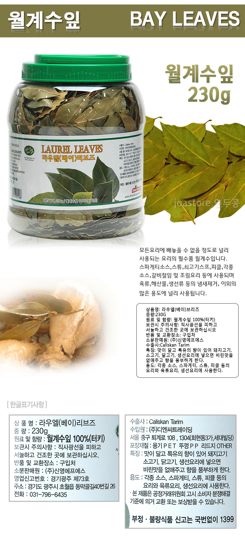 | 원재료 및 함량 | 월계수잎 100%(터키) 월계수잎 100%(터키) |
