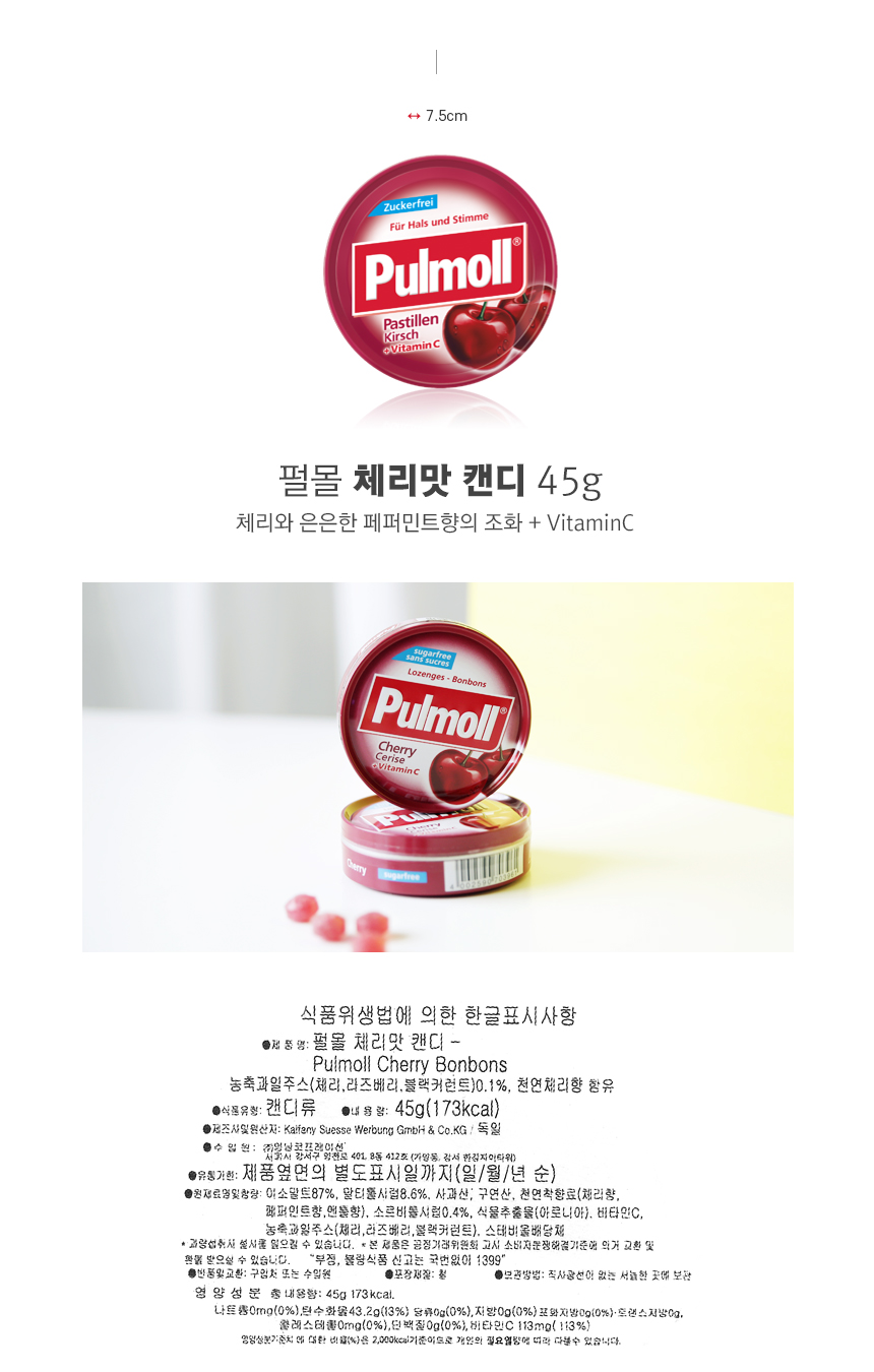 | 원재료 및 함량 | 이소말트87%,말티톨시럽8.6%,사과산,구연산,착향료(체리향,페퍼민트향,멘톨향),소르비톨시럽0.4%,식품추출물(아로니아),비타민C,농축과일주스(체리,라즈배리,블랙커런트),스테비올배당체 |