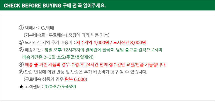 위의 배송기간은 표준 배송 기간이며 재고의 유무, 배송지역, 택배사 사정에 따라 배송기간이 추가 소요될 수 있습니다.