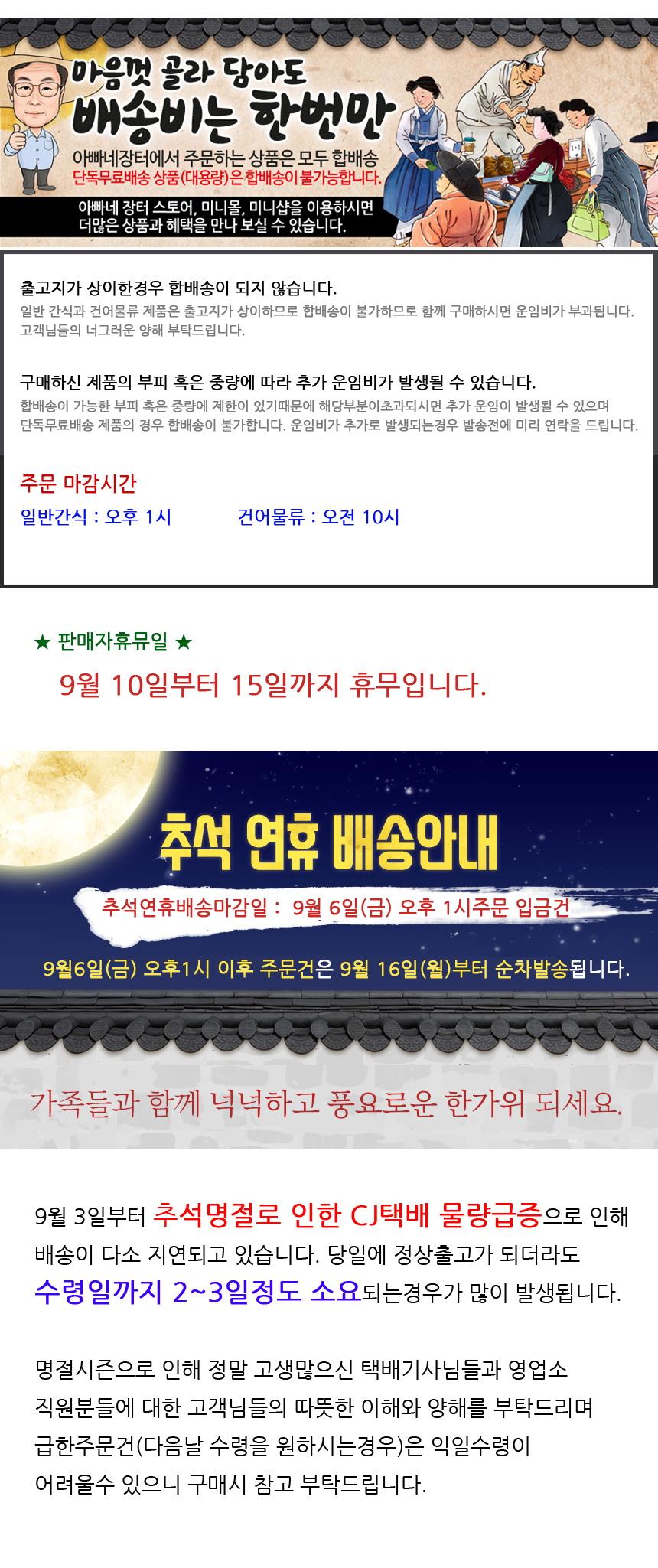 | 휴일(2) | 일반상품 단독 | 오전주문 | 휴무일 | 제품수령 | |||