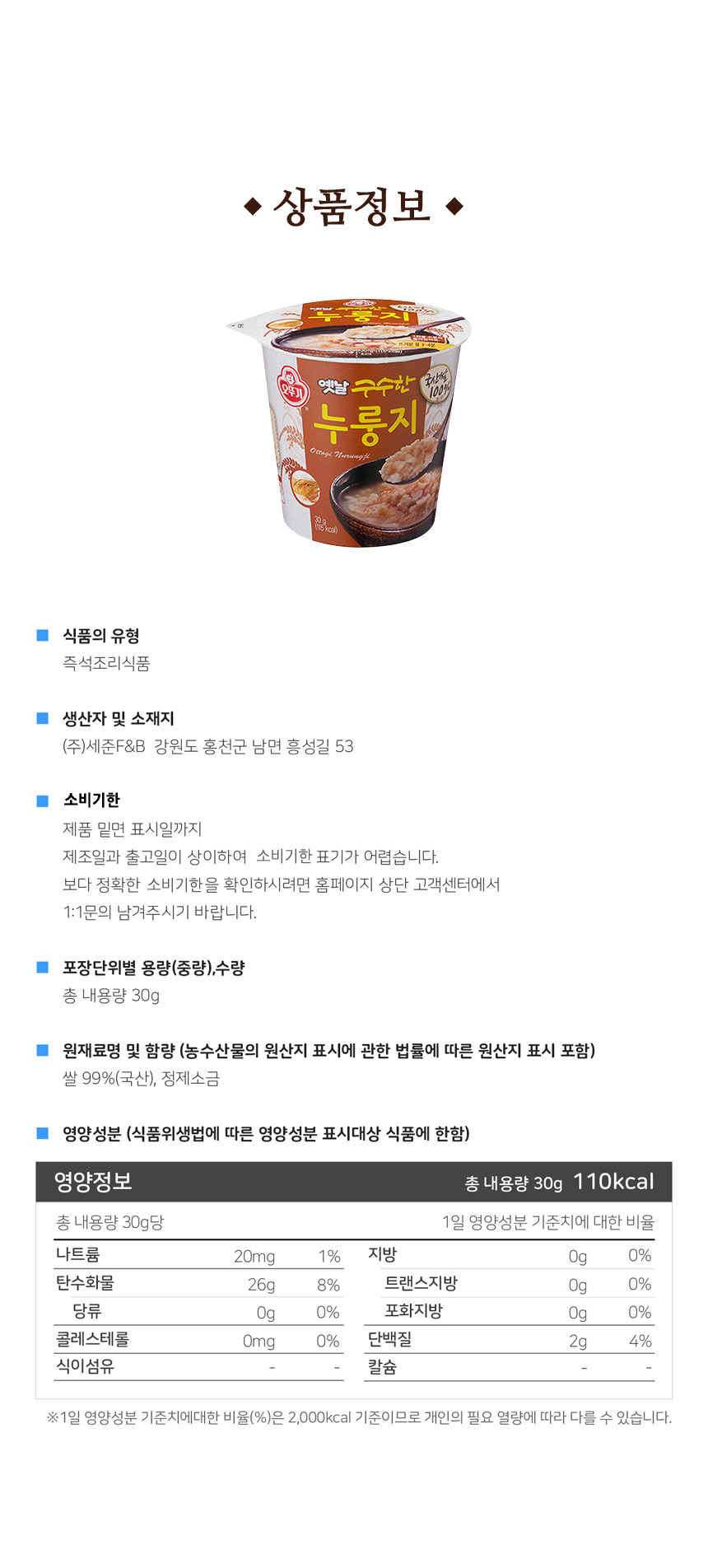 | 생산자 및 소재지/수입자 | 제조원: ㈜세준F&B/ 강원 홍천군 남면 흥성길 53 유통전문판매원: ㈜오뚜기 / 경기도 안양시 동안구 흥안대로 405 |