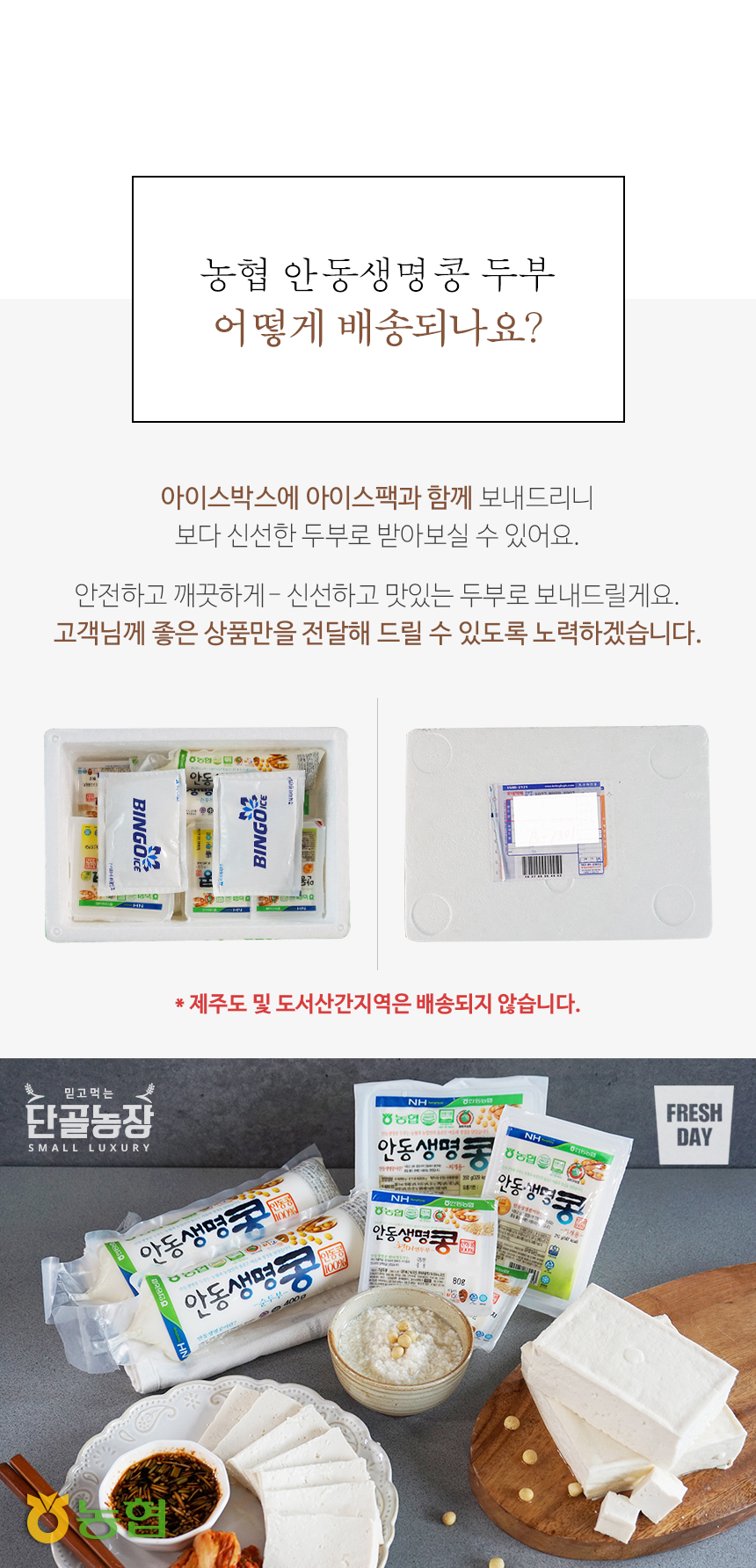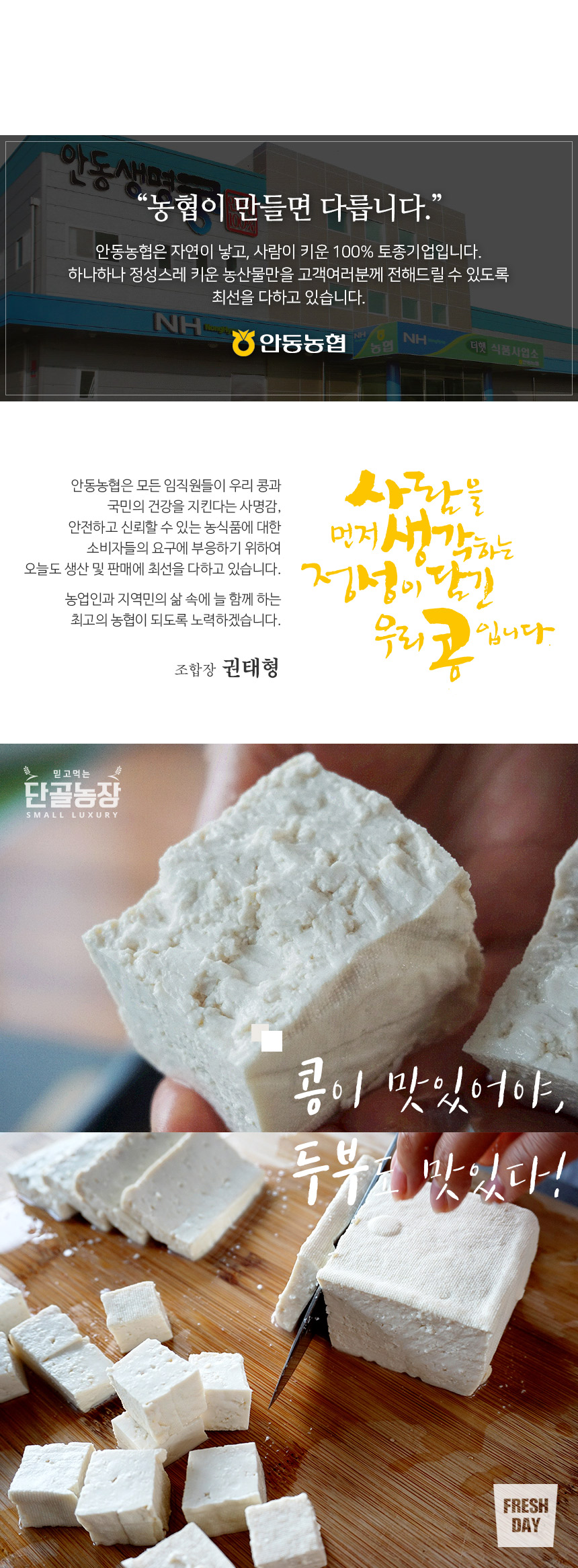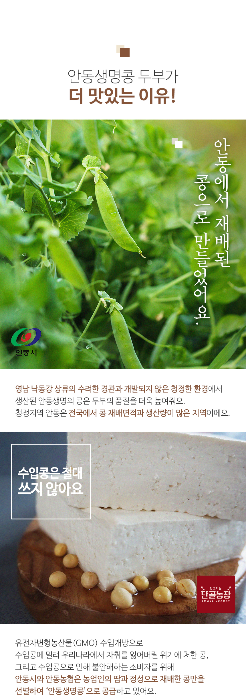 | 원재료 및 함량 | 두부 : 대두100%(국내산), 천연응고제(조제해수염화마그네슘,올리브유,식물성유지) |