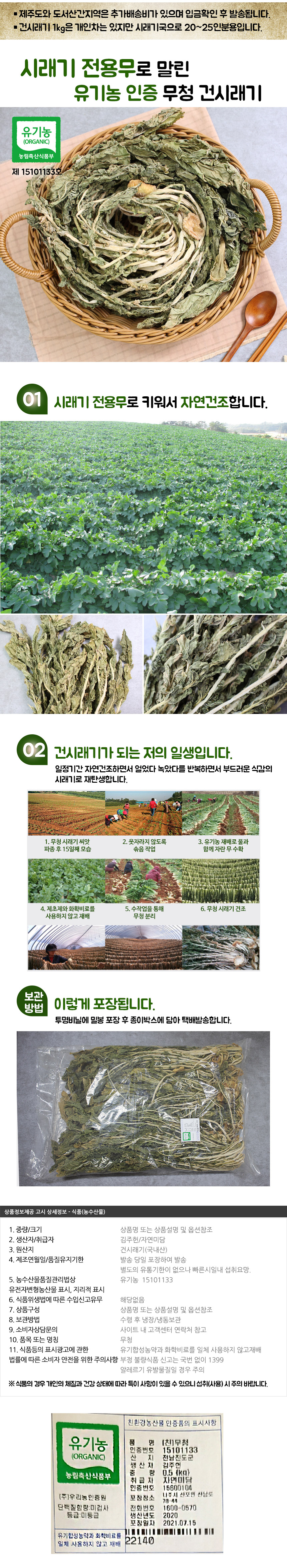 | 품목 또는 명칭 | 시래기 전용무로 말린 유기농 국내산 무청 건시래기 500g |