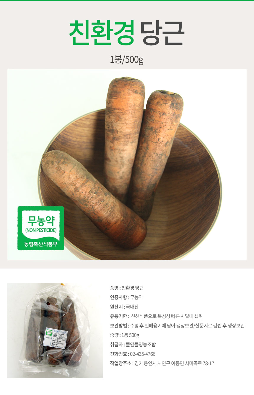 | 품목 또는 명칭 | 친환경 당근 1봉 500g(무농약) |