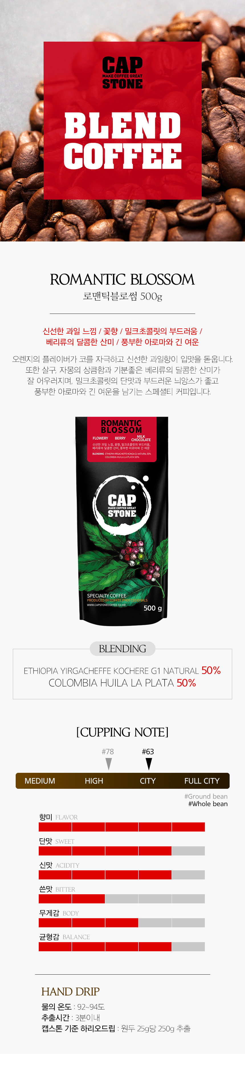 | 포장단위별 내용물의 용량(중량),수량 | 스페셜티 원두커피 로맨틱블로섬 블랜드 500g |