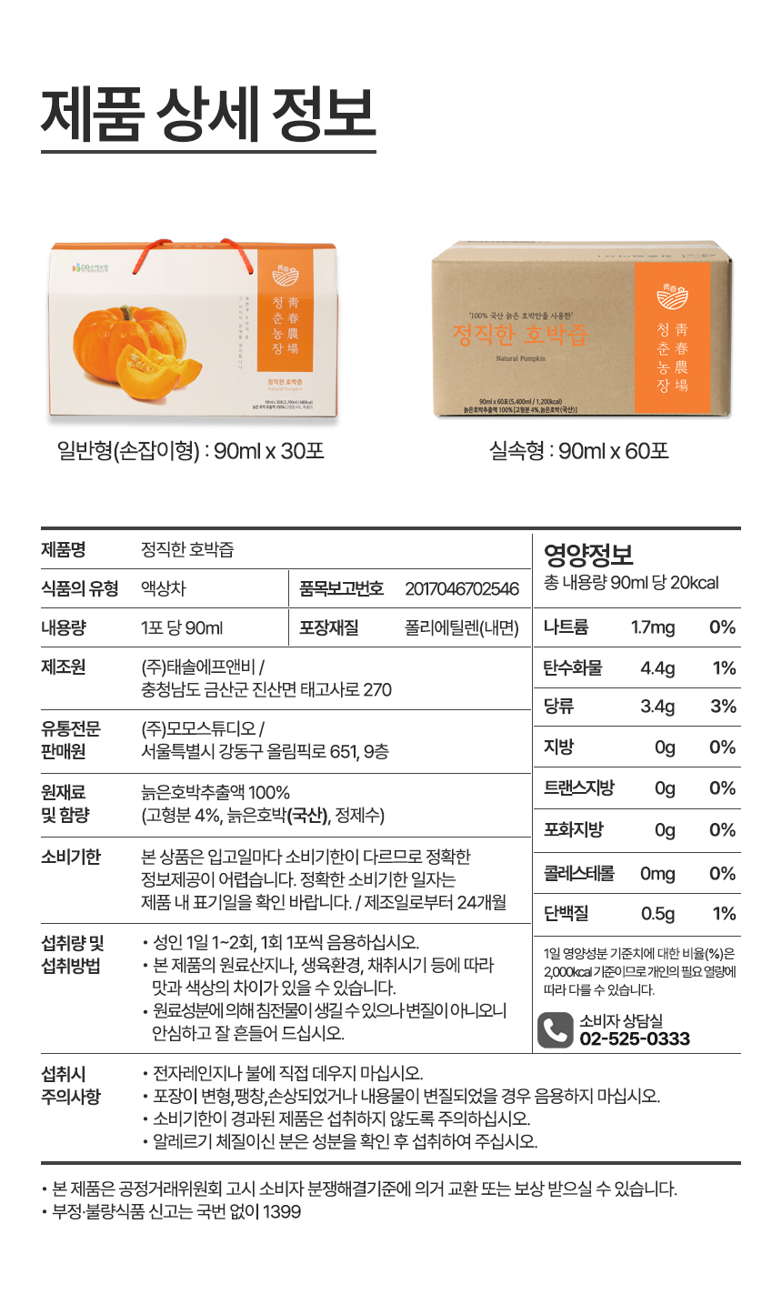 | 원재료 및 함량 | 늙은호박 추출액 100%(고형분 4%, 국내산) |