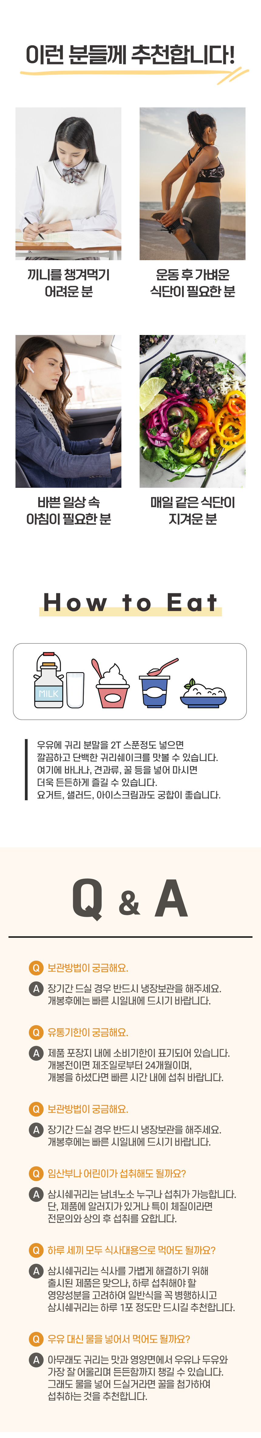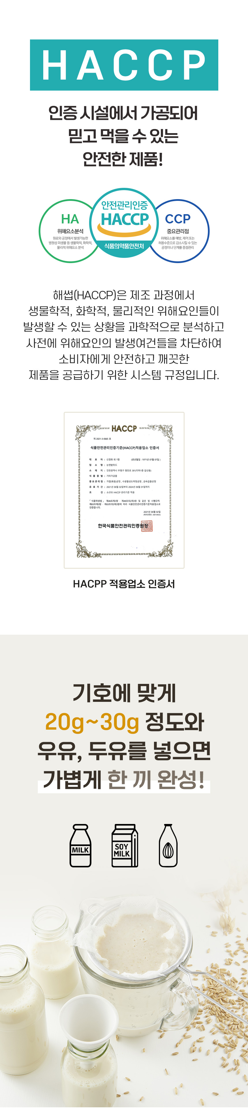 | 소비자안전을 위한 주의사항 | 제품을 개봉시에는 최대한 빠르게 섭취를 권장하며, 제품 섭취전 위아래 좌우로 여러 번 잘 섞이도록 흔들어준 뒤 섭취하시길 바랍니다. 제품의 특성상 식품에 해당하기에 장기간 보관을 원할 경우, 냉장 보관을 권장하며, 제품섭취시 알러지 반응이 있을경우, 섭취를 즉각 멈추고 전문의와 상담후 섭취 하시길 바랍니다. 본제품은 HACCP 인증된 곳에서 안전하게 제조 되었습니다. |