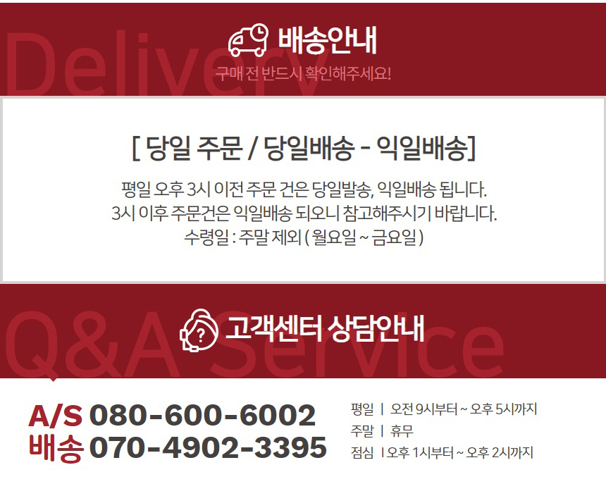 | 휴일(2) | 일반상품 단독 | 오전주문 | 휴무일 | 제품수령 | |||