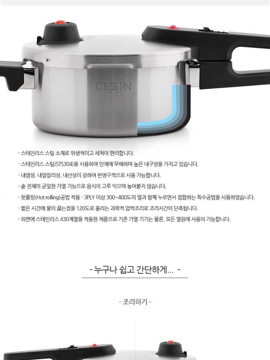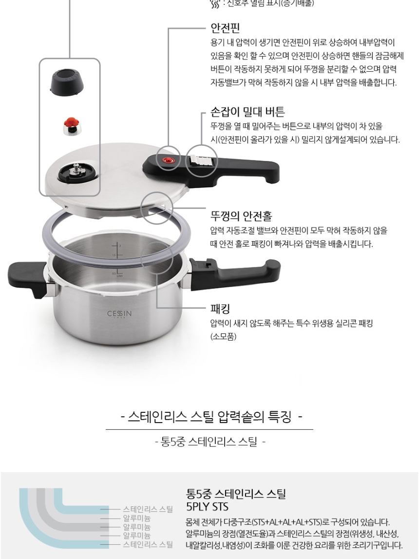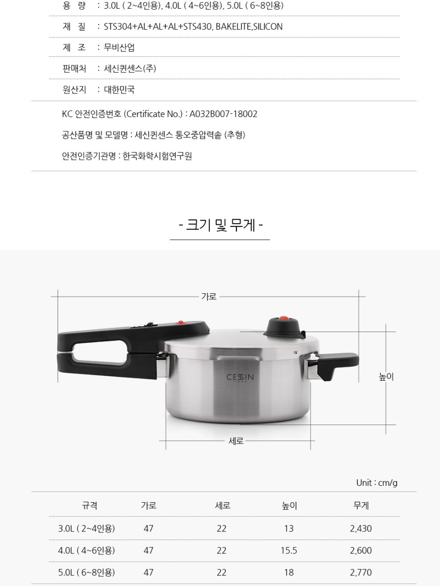 | 품명 및 모델명 | CESSIN 프리미엄 통5중 압력솥 추형 4리터 |