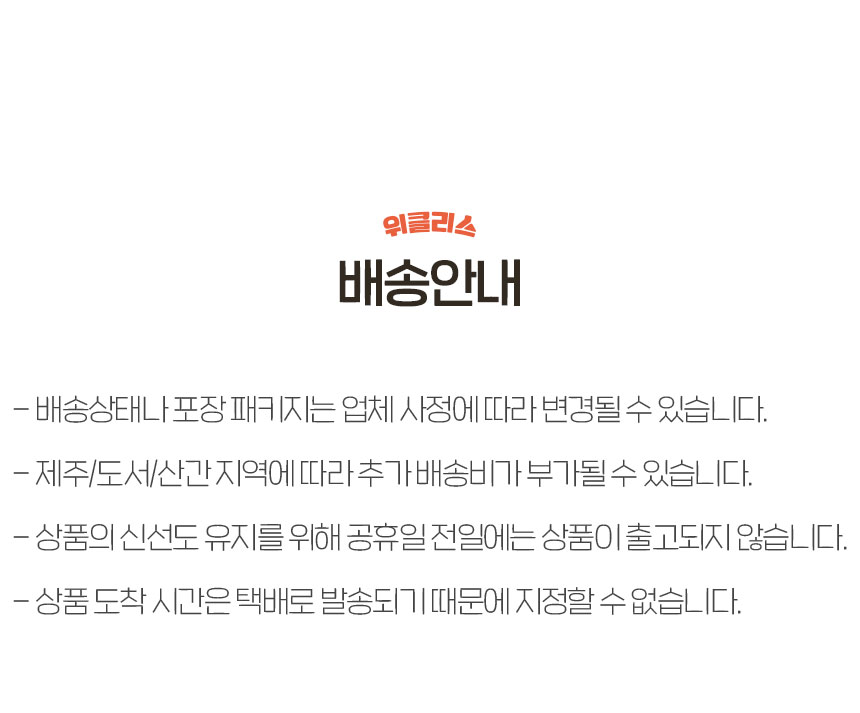 위의 배송기간은 표준 배송 기간이며 재고의 유무, 배송지역, 택배사 사정에 따라 배송기간이 추가 소요될 수 있습니다.
