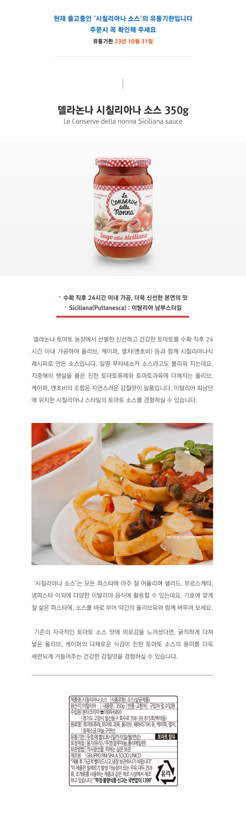 | 원재료 및 함량 | 토마토퓨레,토마토과육,올리브,해바라기씨유,케이퍼,멸치,정제소금,마늘,구연산 |