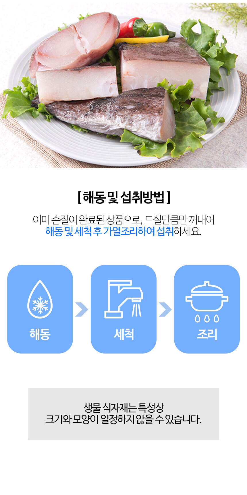 | 식품 등의 표시,광고에 관한 법뮬에 따른 소비자 안전을 위한 주의사항 | 이미 냉동된 바 있으니 해동 후 재냉동시키지 마시기 바랍니다. |
