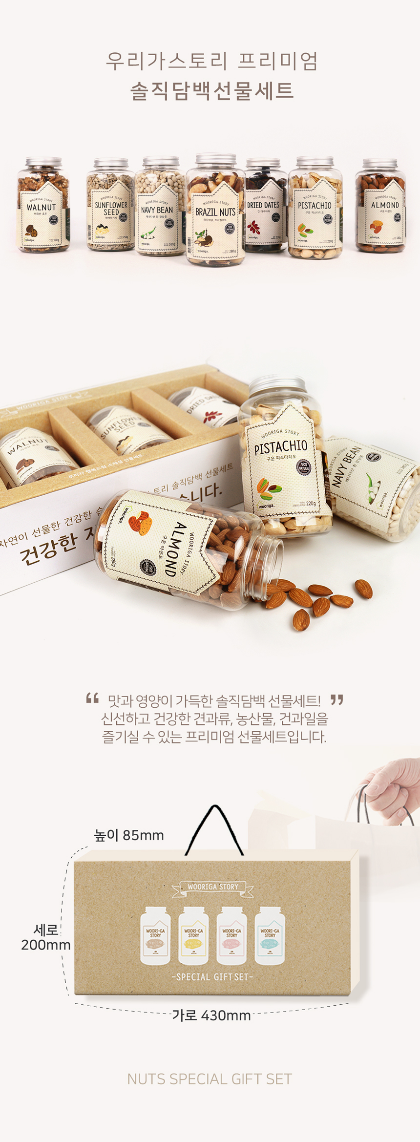 | 상품구성 | 호두170g 2통+해바라기씨250g 1통+대추야자250g 1통 |