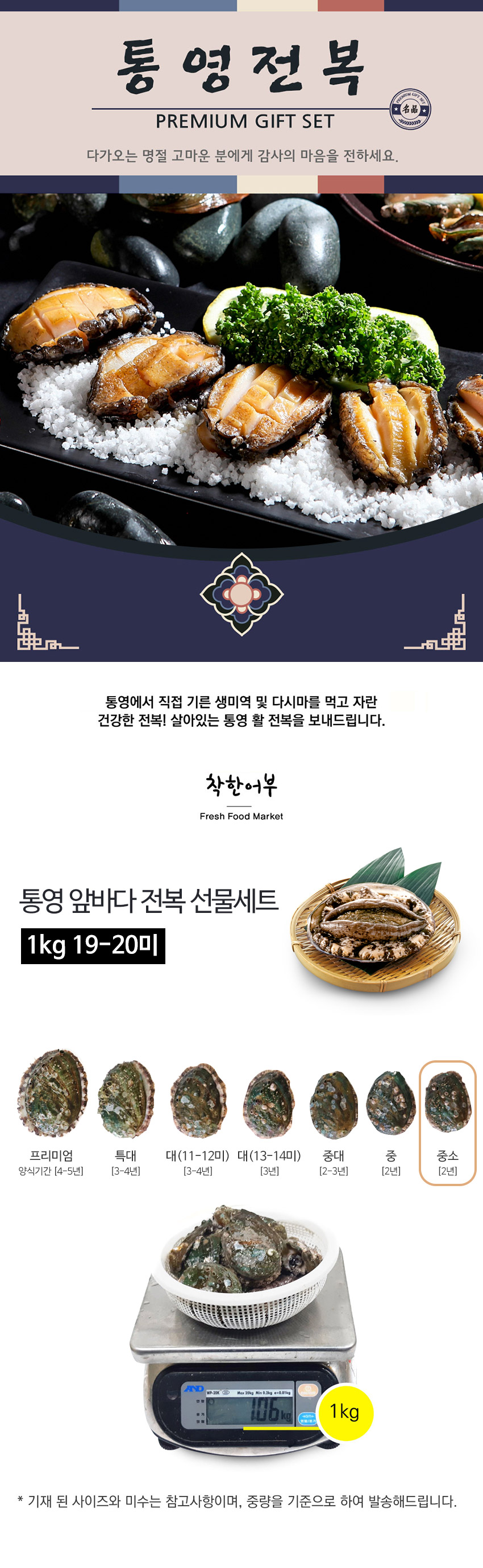 | 포장단위별 내용물의 용량(중량),수량,크기 | 선물세트 통영전복 1kg 19-20미, 중량으로 표기되는 상품은 크기를 기재할 수 없음 |