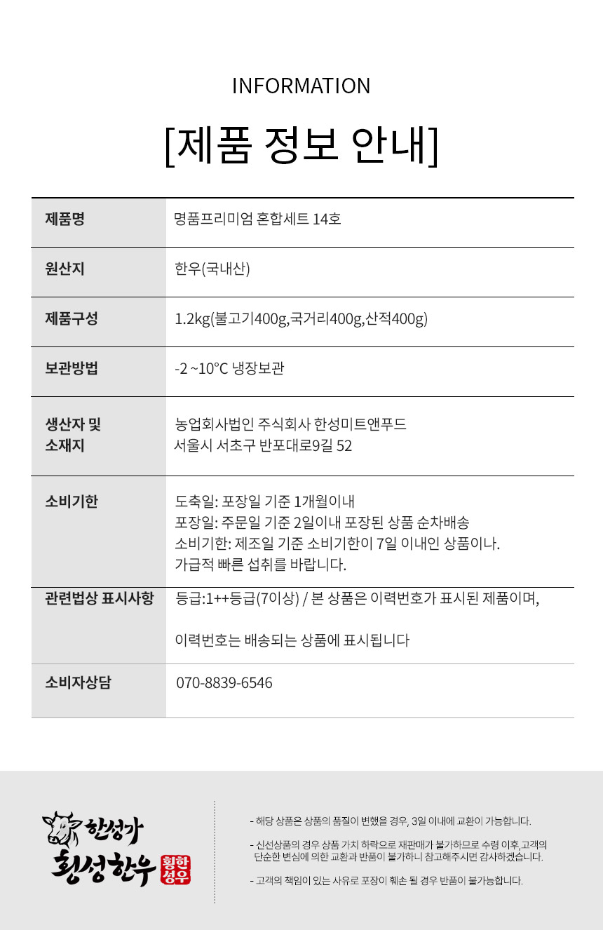 | 생산자(수입자) | 농업회사법인 주식회사 한성미트앤푸드/서울시 서초구 반포대로9길 52 등급:1++등급(7이상) / 본 상품은 이력번호가 표시된 제품이며, 이력번호는 배송되는 상품에 표시됩니다 |