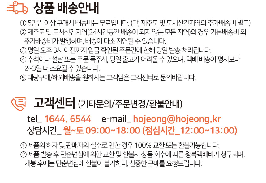 위의 배송기간은 표준 배송 기간이며 재고의 유무, 배송지역, 택배사 사정에 따라 배송기간이 추가 소요될 수 있습니다.