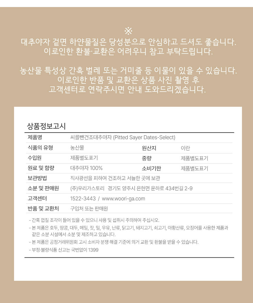 | 식품 등의 표시,광고에 관한 법뮬에 따른 소비자 안전을 위한 주의사항 | 특정질환, 특이체질, 알레르기체질의 경우 과민반응이 나타날 수 있으므로 표기사항 확인 후 섭취요망. 이제품은 밀,대두,우유,굴,소고기,조개류를 사용한 제품과 같은 소분시설에서 소분 및 제조하고 있습니다. 본 제품은 공정거래 위원회 고시 소비자 분쟁 해결 기준에 의거 교환 또는 보상 받으실수 있습니다. 부정.불량 식품 신고는 국번 없이 1399 |