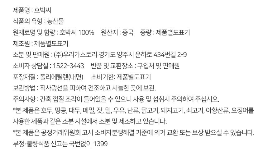 | 식품 등의 표시,광고에 관한 법뮬에 따른 소비자 안전을 위한 주의사항 | 알레르기체질, 특정질환, 특이체질,의 경우 과민반응이 나타날 수 있으므로 표기사항 확인 후 섭취요망 이제품은 밀,대두,우유,굴,소고기,조개류를 사용한 제품과 같은 소분시설에서 소분 및 제조하고 있습니다. 본 제품은 공정거래 위원회 고시 소비자 분쟁 해결 기준에 의거 교환 또는 보상 받으실수 있습니다. 부정&불량 식품 신고는 국번 없이 1399 |