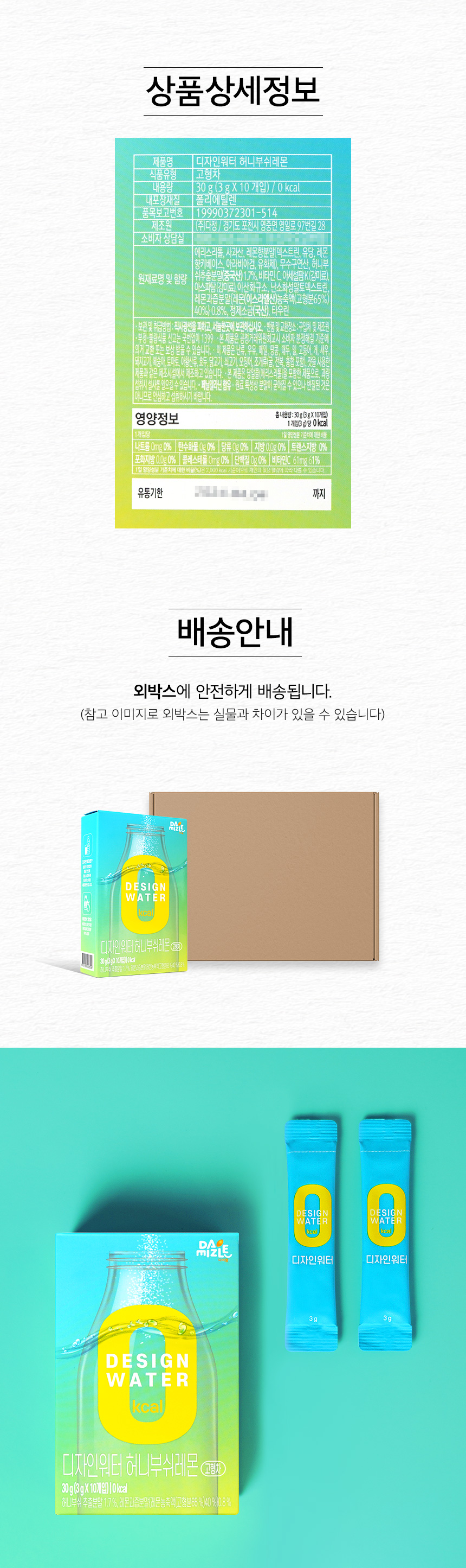 | 원재료 및 함량 | 허니부쉬잎1.7%[허니부쉬추출분말]/레몬과즙분말0.8%[레몬농축액40%]/에리스리톨/DL-사과산/레몬향분말[덱스트린/유당/레몬향키베이스1/아라비아검/폴리소르베이트20/비타민C/아세설팜칼륨/아스파탐/이산화규소/난소화성말토덱스트린/정제소금/타우린 |