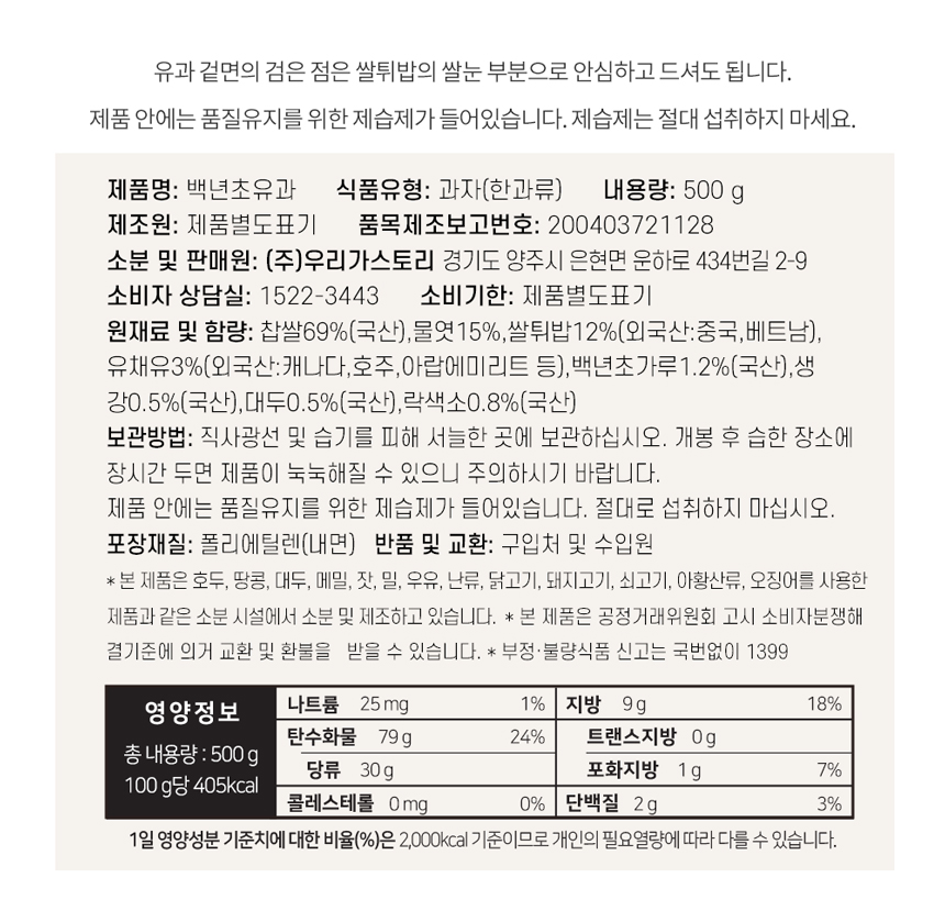 | 소비자안전을 위한 주의사항 | 알레르기체질, 특정질환, 특이체질,의 경우 과민반응이 나타날 수 있으므로 표기사항 확인 후 섭취요망 이제품은 밀,대두,우유,굴,소고기,조개류를 사용한 제품과 같은 소분시설에서 소분 및 제조하고 있습니다. 본 제품은 공정거래 위원회 고시 소비자 분쟁 해결 기준에 의거 교환 또는 보상 받으실수 있습니다. 부정&불량 식품 신고는 국번 없이 1399 |