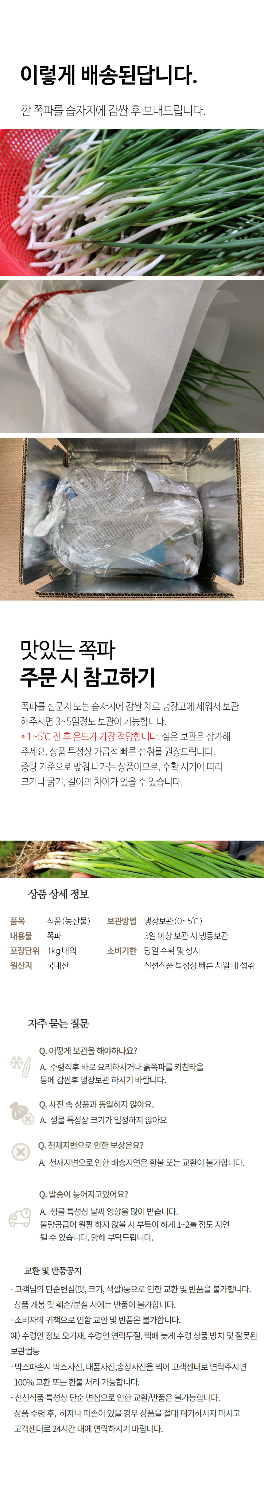 | 포장단위별 내용물의 용량(중량),수량,크기 | 쪽파 1kg 내외(1단), 크기는 상품마다 차이가 있어 정확한 정보제공이 어렵습니다. |
