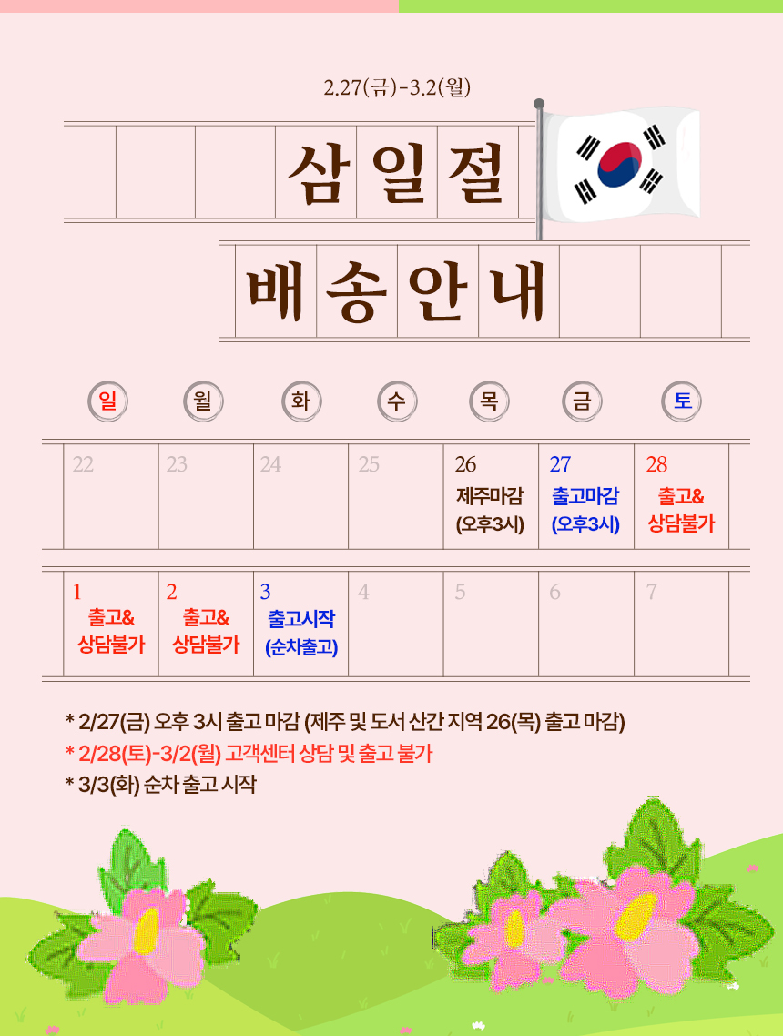 | 휴일(2) | 일반상품 단독 | 오전주문 | 휴무일 | 제품수령 | |||