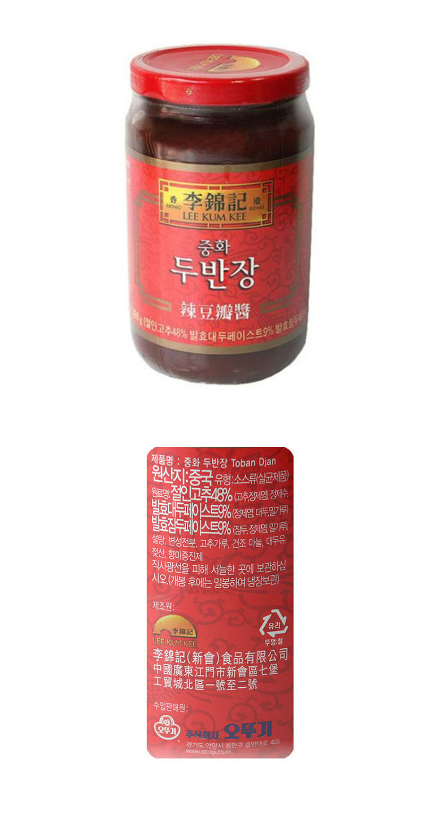 | 원재료 및 함량 | 절인고추48%(고추,정제염,정제수),발효대두페이스트9%(정제염,대두,밀가루),발효잠두페이스트9%(잠두,정제염,밀가루),설탕,변성전분,고추가루,건조마늘,대두유,젖산,향미증진제 |