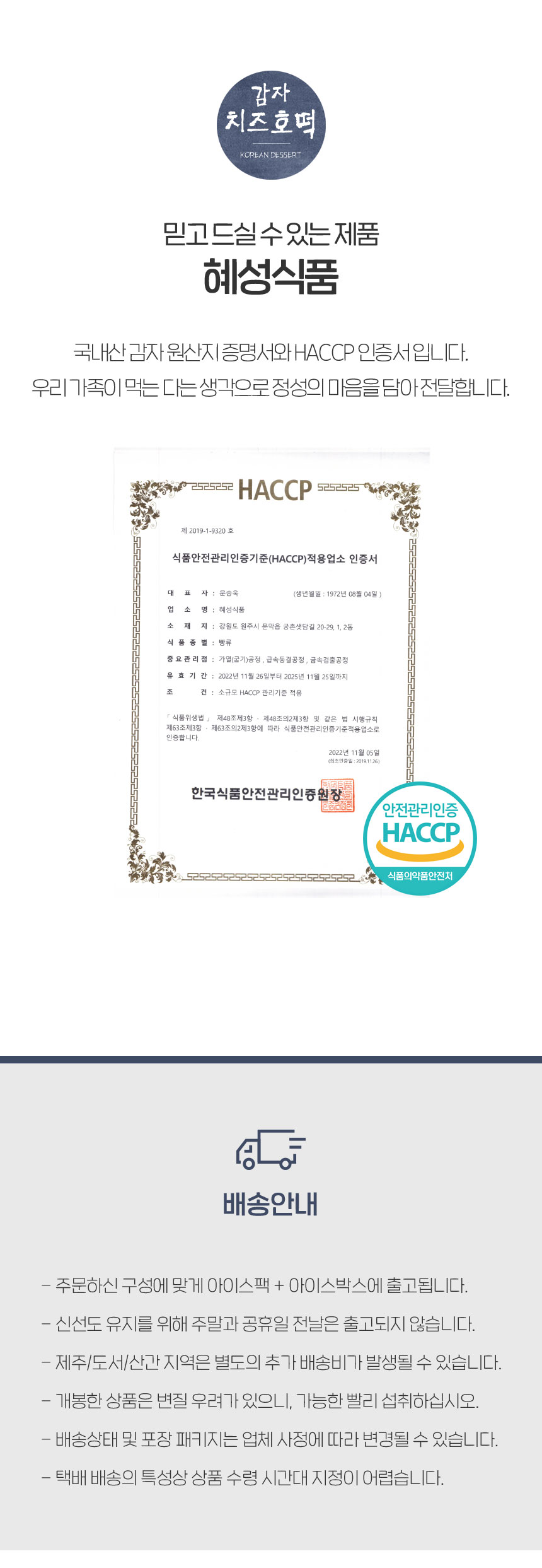 | 생산자 및 소재지/수입자 | ㈜혜성식품 / 강원도 원주시 문막읍 궁촌샛담길 20-29 |