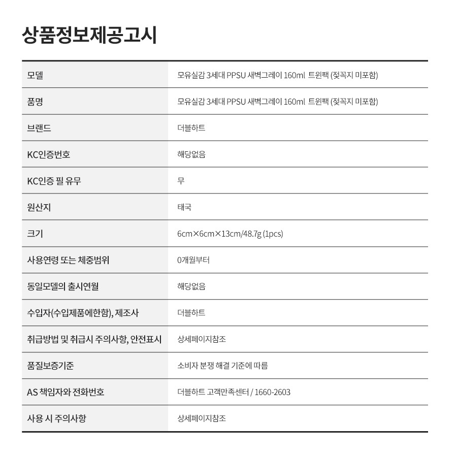 | 품명 및 모델명 | 모유실감 3세대 PPSU 새벽그레이 160ml 트윈팩 (노꼭지) |