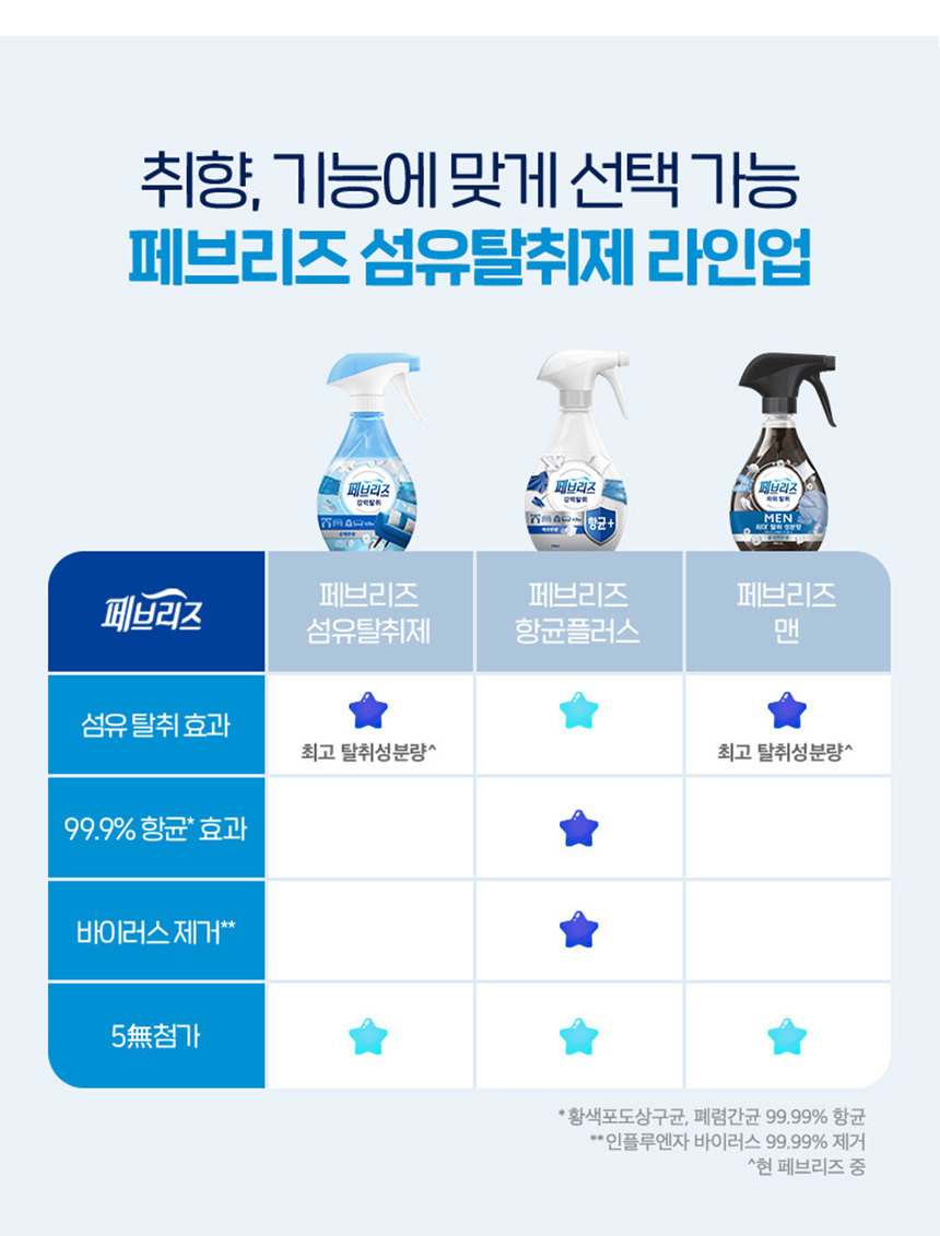 | 사용 시 주의사항 | 울이나 모제품, 물세탁이 안되는 제품(실크, 레이온, 아세테이트 마 등)이나 물에 약한섬유, 방수처리된 제품에는 얼룩이 생길 수 있으므로 미리 눈에 띄지 않는 곳에 테스트 해 보신 후 사용하세요. 오염물이 묻어있는 섬유에 뿌릴 경우 얼룩이 생길 수 있습니다. 가죽이나 세무, 모피 제품에 뿌리지 마세요. 한 곳에 집중적으로 뿌리지 마세요. 얼룩이나 끈적거림의 원인이 될 수 있습니다. 섬유제품 이외의 곳에 페브리즈가 묻으면 바로 닦아주세요. 다른 용도로 사용하지 마세요. 어린이와 애완동물 가까이 보관하지 마십시오. 얼굴이나 사람을 향해 뿌리지 마세요. 눈에 들어간 경우에는 물로 깨끗이 씻어주세요. 마시지 마세요. 마신경우 물을 마시게 하고, 필요하면 의사의 도움을 받으세요. 직사광선이 비추는 곳이나 심한 온도 변화가 있을 수 있는 곳(전자제품 위)에 두지 마세요. 좁은 공간에서 사용 시 잘 환기해 주세요. 다량 흡입시 위해가 우려되니 사람이나 동물, 공기 중에 분사하지 마시오. 향료성분 리모넨 함유로 피부알러지를 유발할 수 있음. |