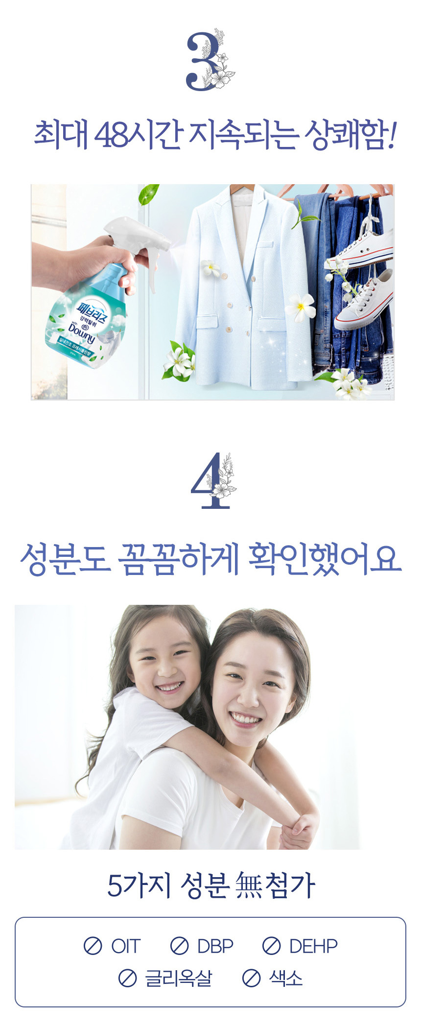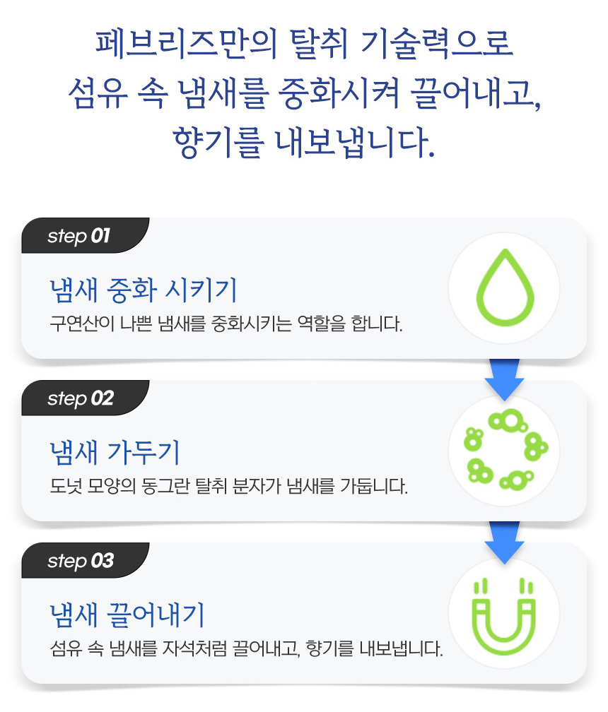 | 사용 시 주의사항 | 울이나 모제품, 물세탁이 안되는 제품(실크, 레이온, 아세테이트 마 등)이나 물에 약한섬유, 방수처리된 제품에는 얼룩이 생길 수 있으므로 미리 눈에 띄지 않는 곳에 테스트 해 보신 후 사용하세요. 오염물이 묻어있는 섬유에 뿌릴 경우 얼룩이 생길 수 있습니다. 가죽이나 세무, 모피 제품에 뿌리지 마세요. 한 곳에 집중적으로 뿌리지 마세요. 얼룩이나 끈적거림의 원인이 될 수 있습니다. 섬유제품 이외의 곳에 페브리즈가 묻으면 바로 닦아주세요. 다른 용도로 사용하지 마세요. 어린이와 애완동물 가까이 보관하지 마십시오. 얼굴이나 사람을 향해 뿌리지 마세요. 눈에 들어간 경우에는 물로 깨끗이 씻어주세요. 마시지 마세요. 마신경우 물을 마시게 하고, 필요하면 의사의 도움을 받으세요. 직사광선이 비추는 곳이나 심한 온도 변화가 있을 수 있는 곳(전자제품 위)에 두지 마세요. 좁은 공간에서 사용 시 잘 환기해 주세요. 다량 흡입시 위해가 우려되니 사람이나 동물, 공기 중에 분사하지 마시오. 향료성분 리모넨 함유로 피부알러지를 유발할 수 있음. |