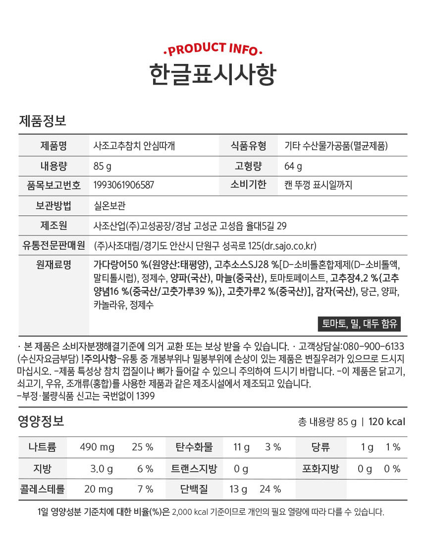 [사조] 고추참치(안심따개) 85g X 1캔 /참치캔/통조림상품상세_동원몰