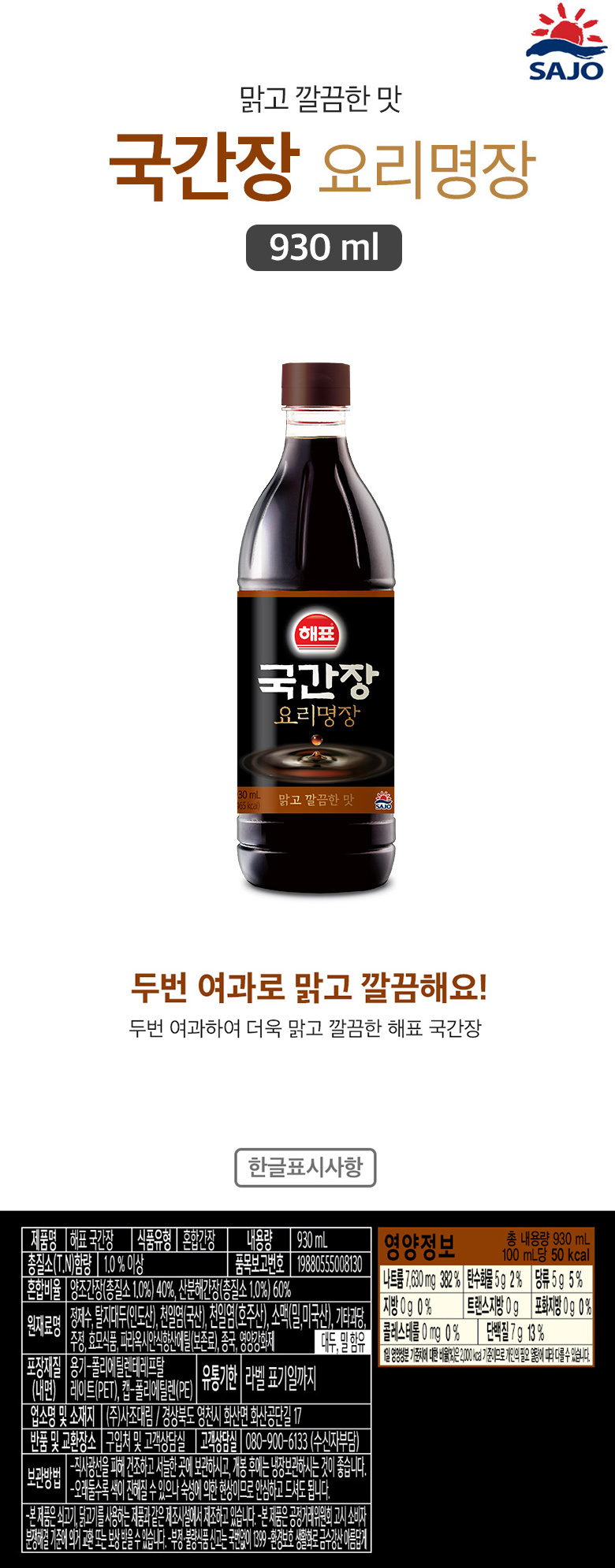 | 품명 | [푸른들마켓][해표] 국간장(요리명장)930ml |