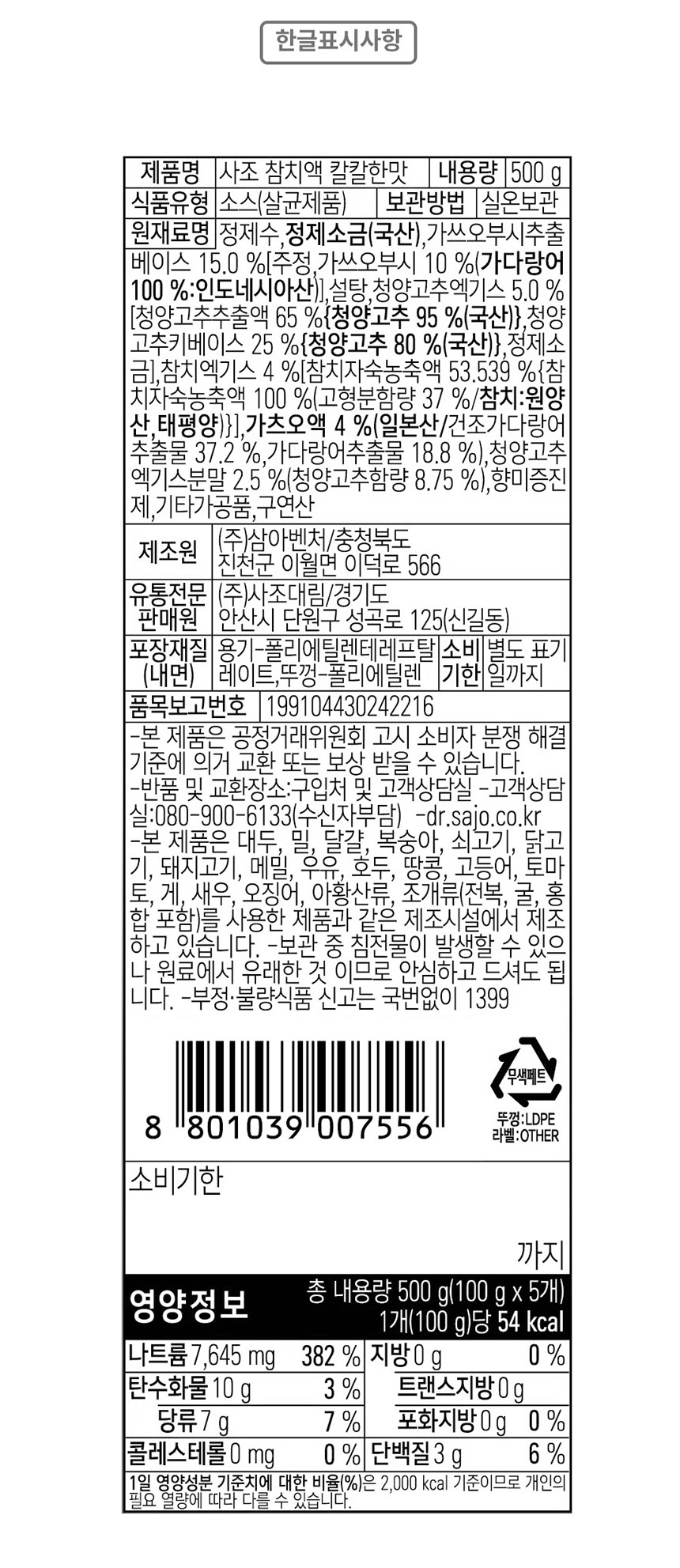 | 영양성분 | 상세설명 참조 |