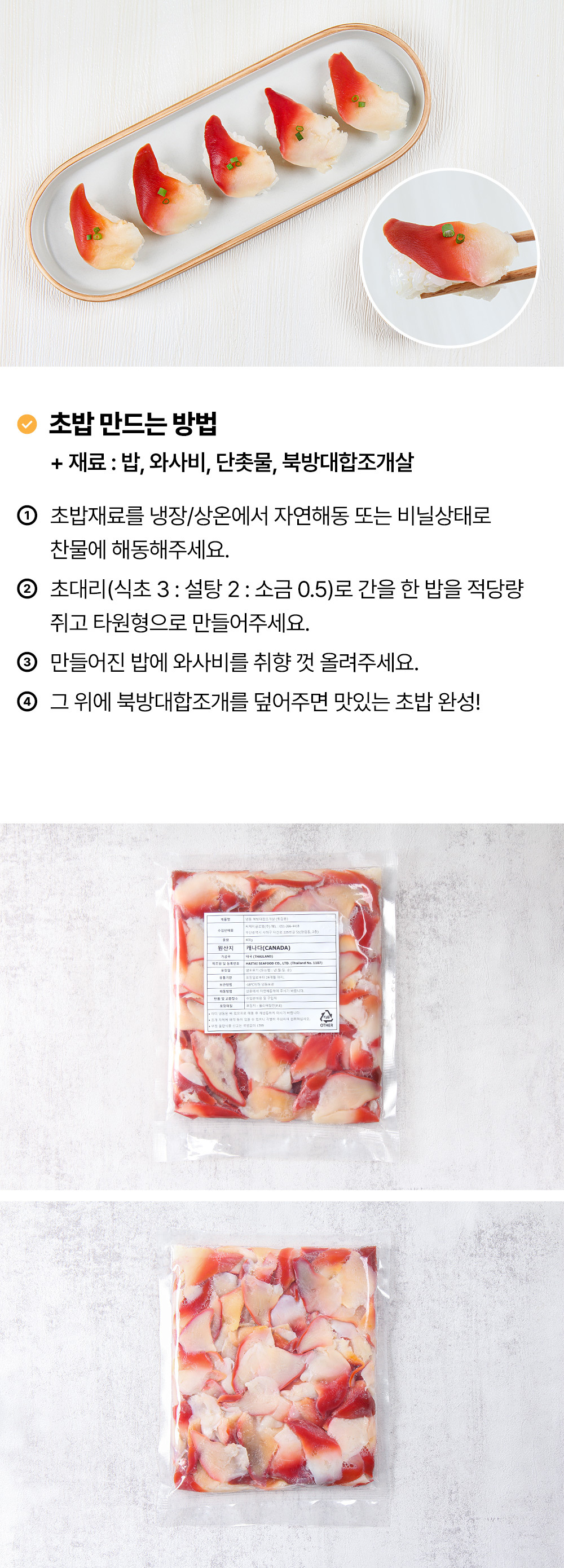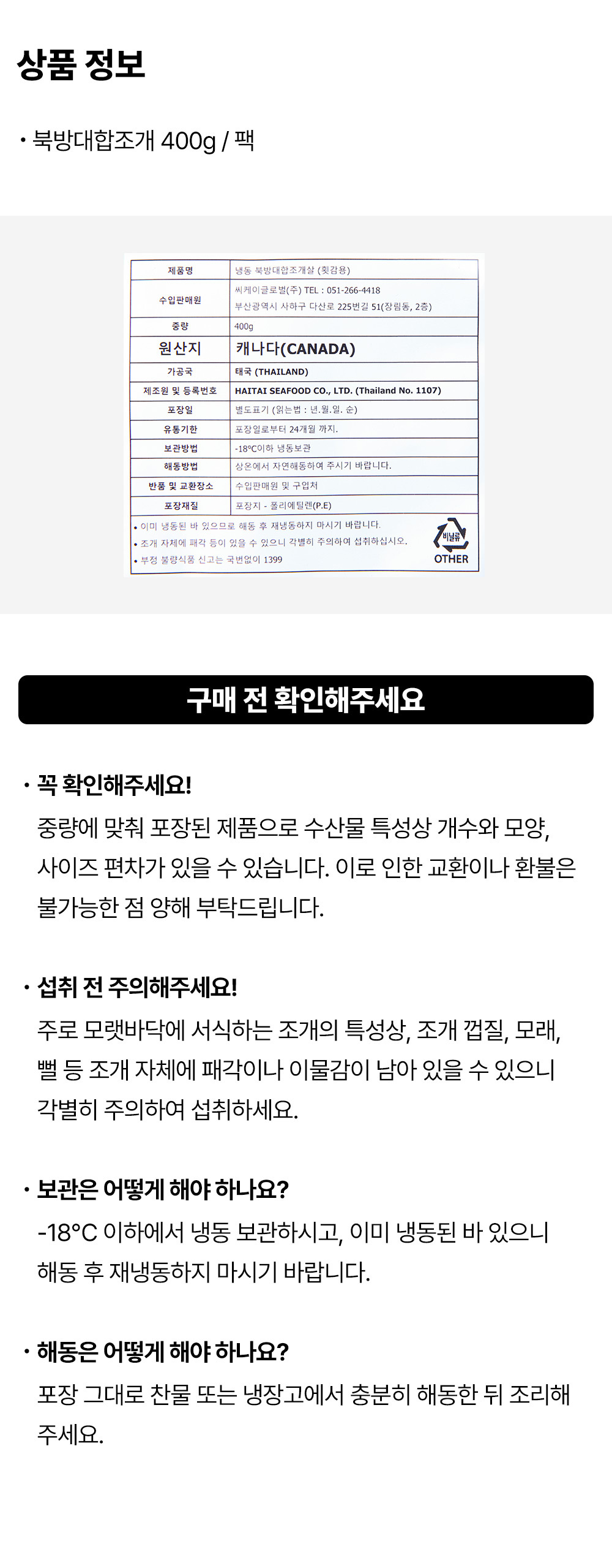 | 보관방법 또는 취급방법 | -18도 이하 냉동보관조개 특성상 사분이 있을 수 있으니 섭취전 제거 후 유의하여 드세요 |