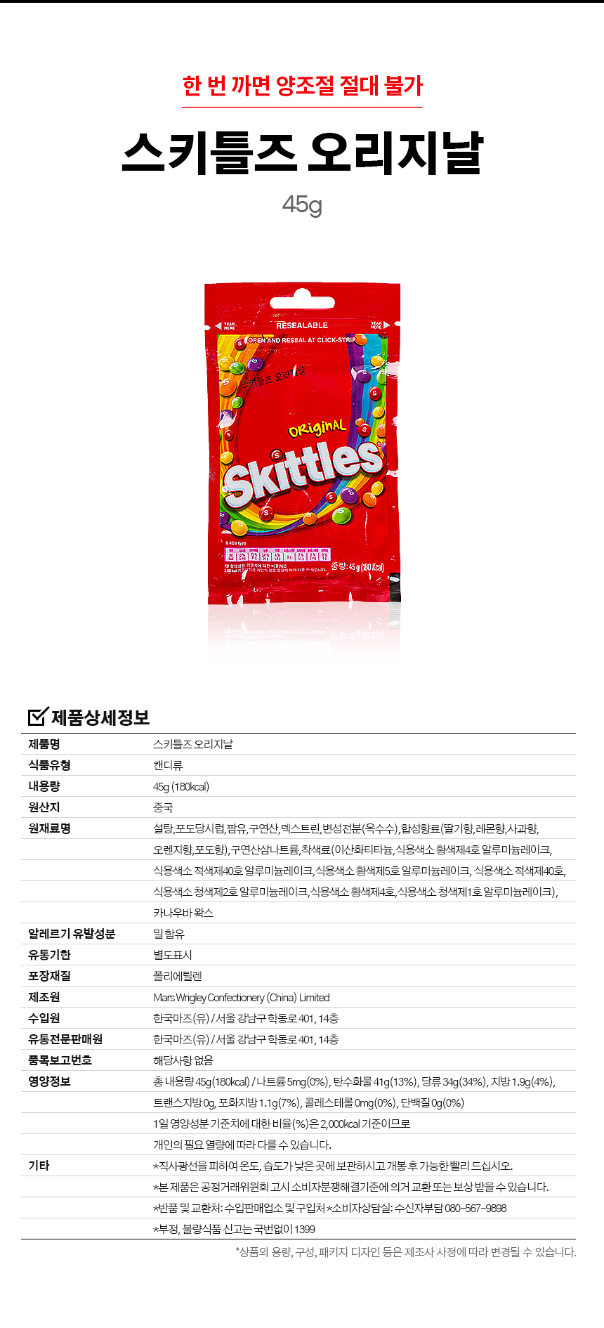 새콤달콤 츄잉캔디 스키틀즈 오리지날 45g상품상세_동원몰