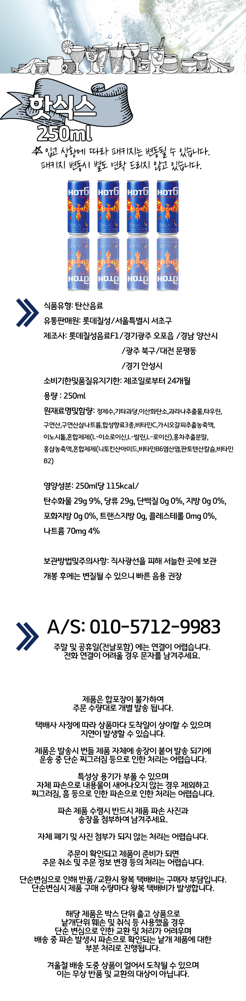 | 포장단위별 내용물의 용량(중량),수량 | 핫식스 오리지널 250mlx60캔 |
