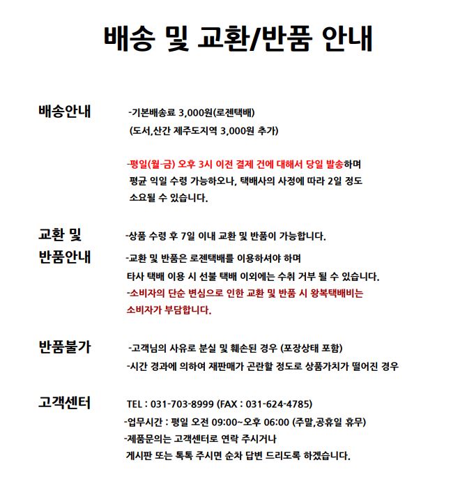 위의 배송기간은 표준 배송 기간이며 재고의 유무, 배송지역, 택배사 사정에 따라 배송기간이 추가 소요될 수 있습니다.