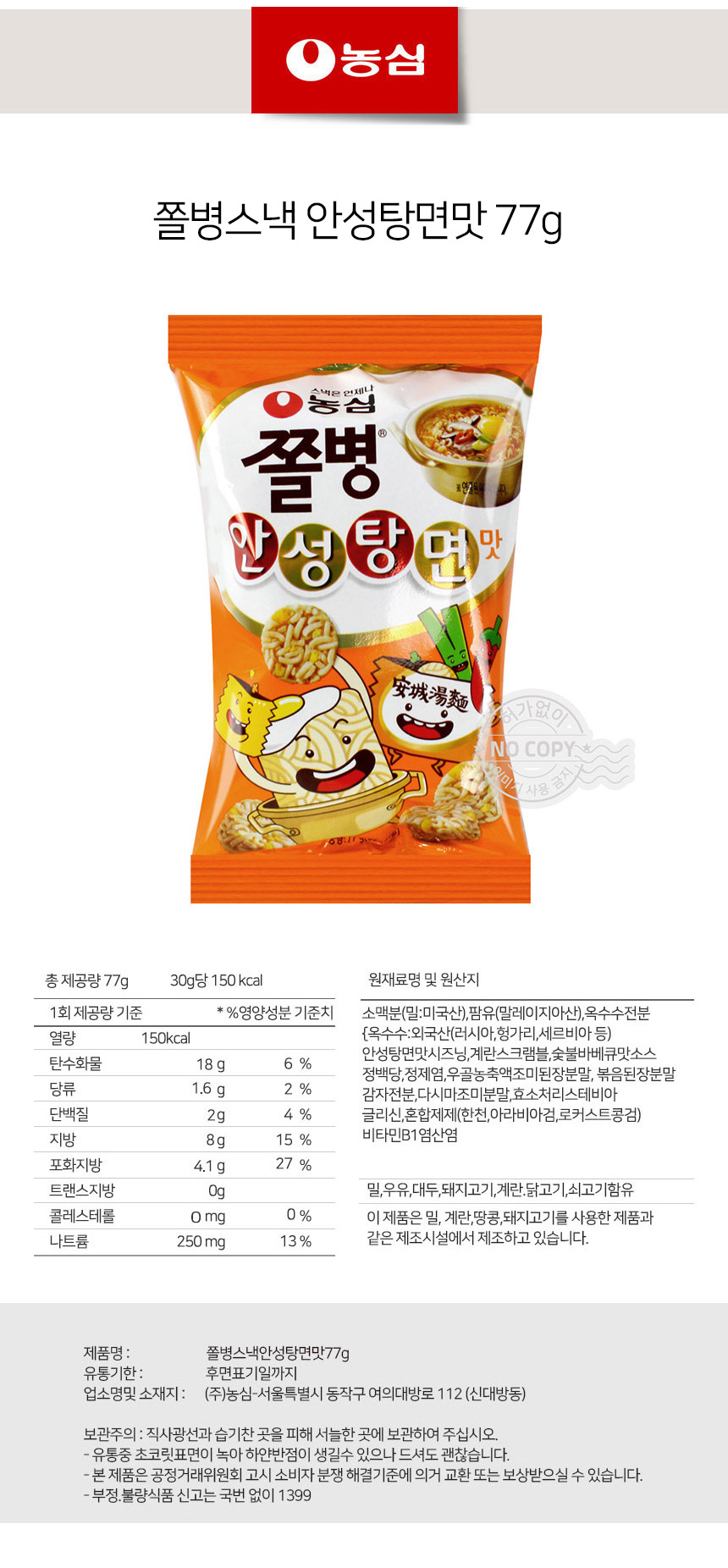 바삭과자 간식타임 농심 쫄병스낵안성탕면맛 77g상품상세_동원몰
