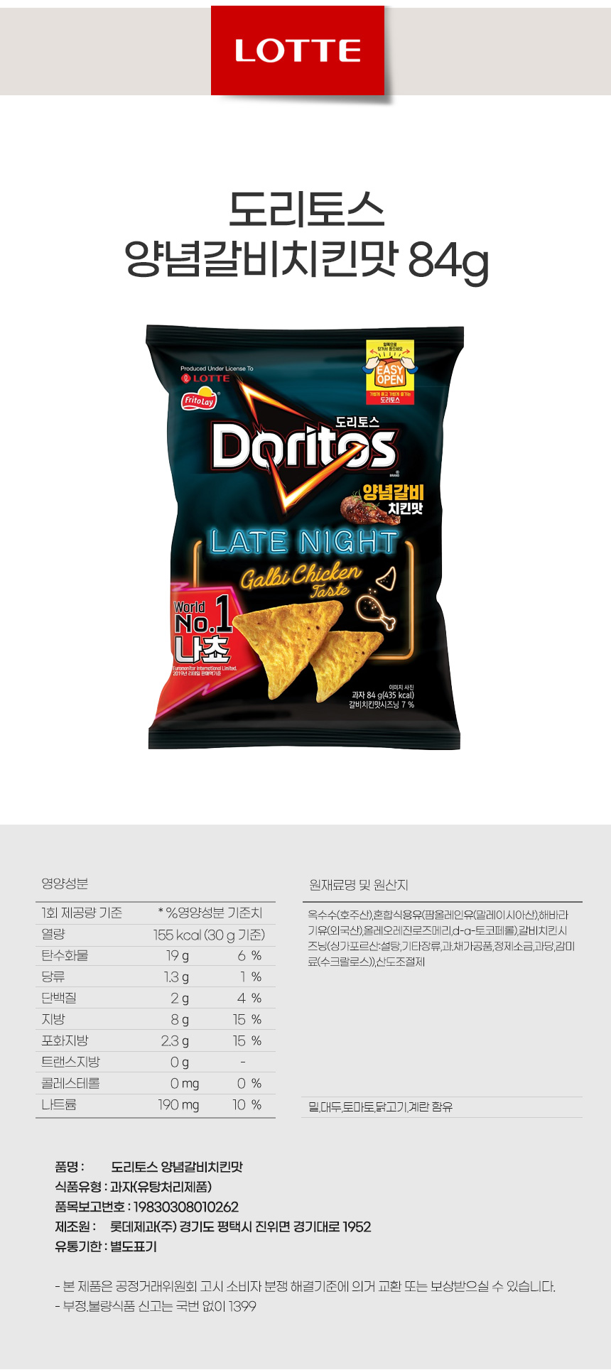 바삭과자 간식타임 롯데 도리토스 양념갈비치킨맛 84g상품상세_동원몰