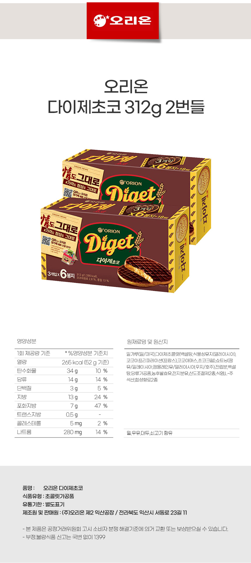 바삭과자 간식타임 오리온 다이제초코 312g 2번들상품상세_동원몰