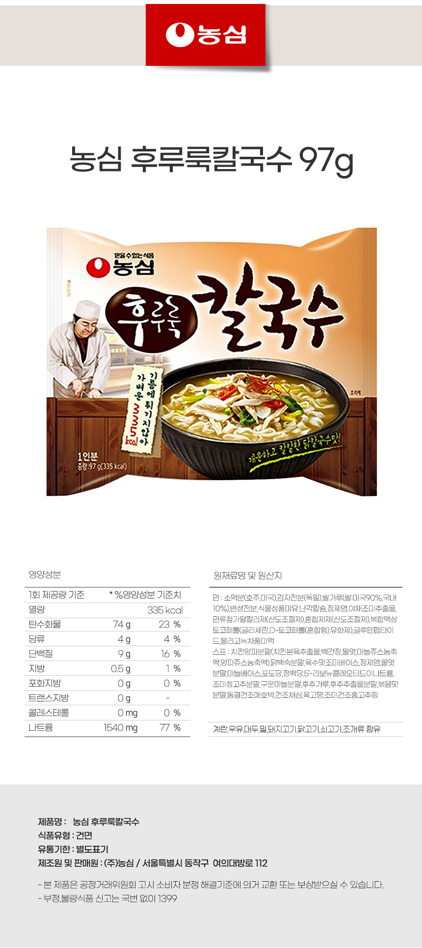 한끼라면 얼큰면 농심 후루룩칼국수 97g상품상세_동원몰