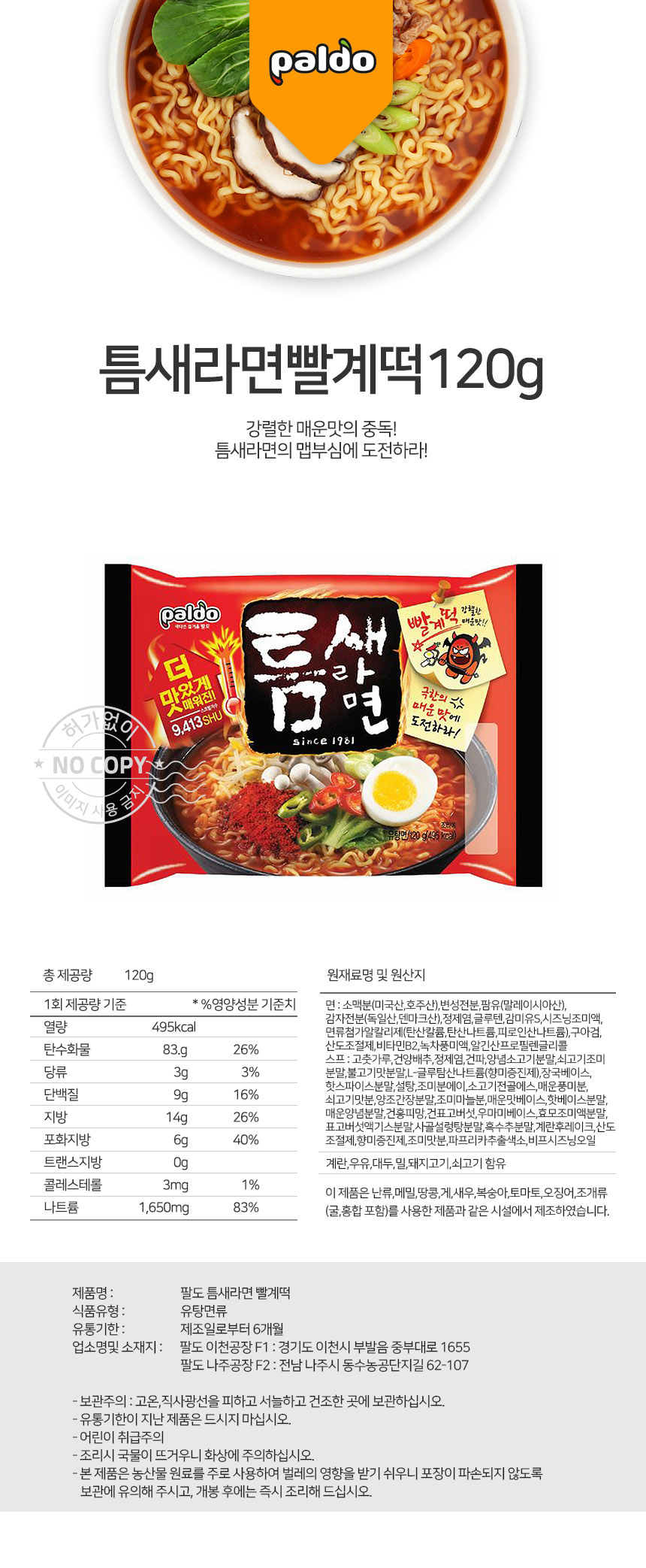 한끼라면 얼큰면 팔도 틈새라면 빨계떡 120g상품상세_동원몰