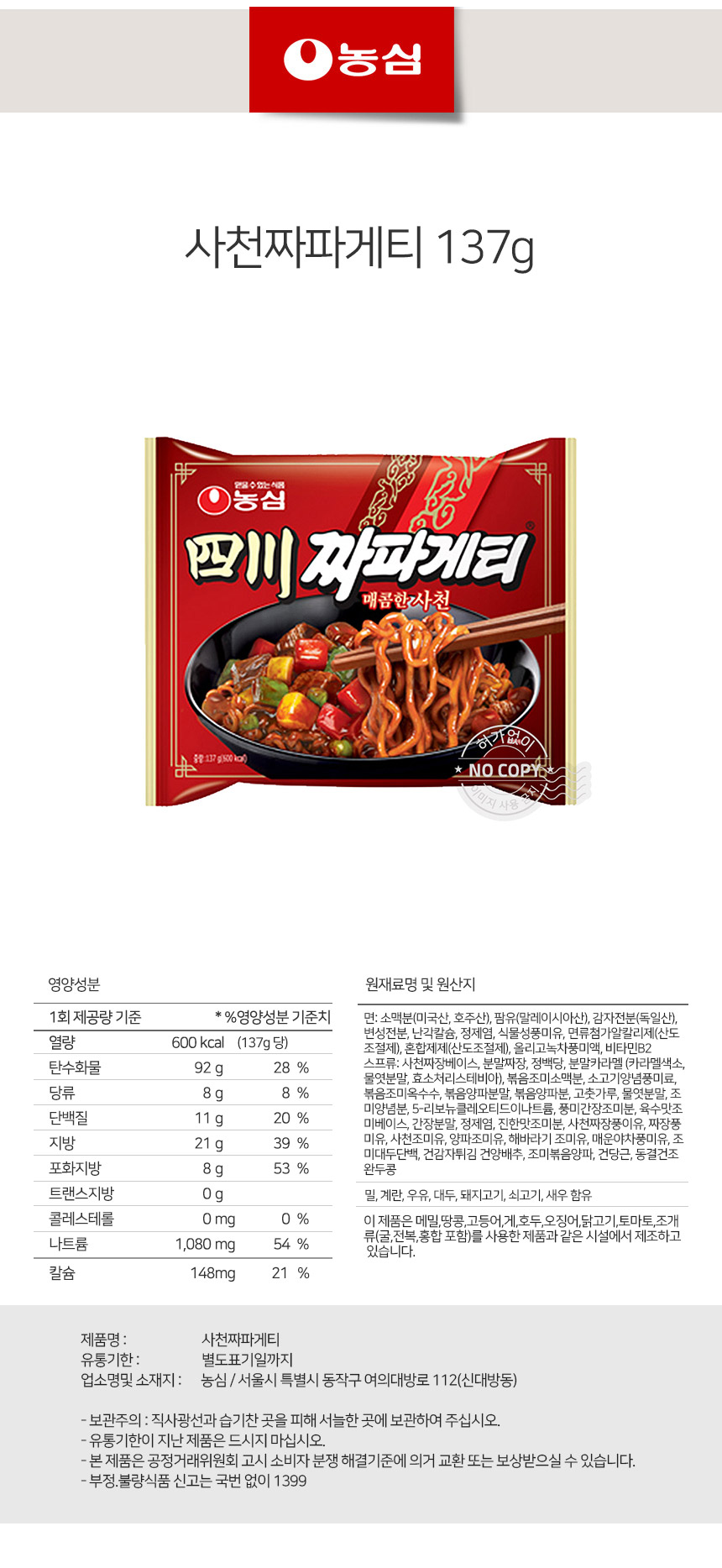 한끼라면 얼큰면 농심 사천짜파게티 137g상품상세_동원몰