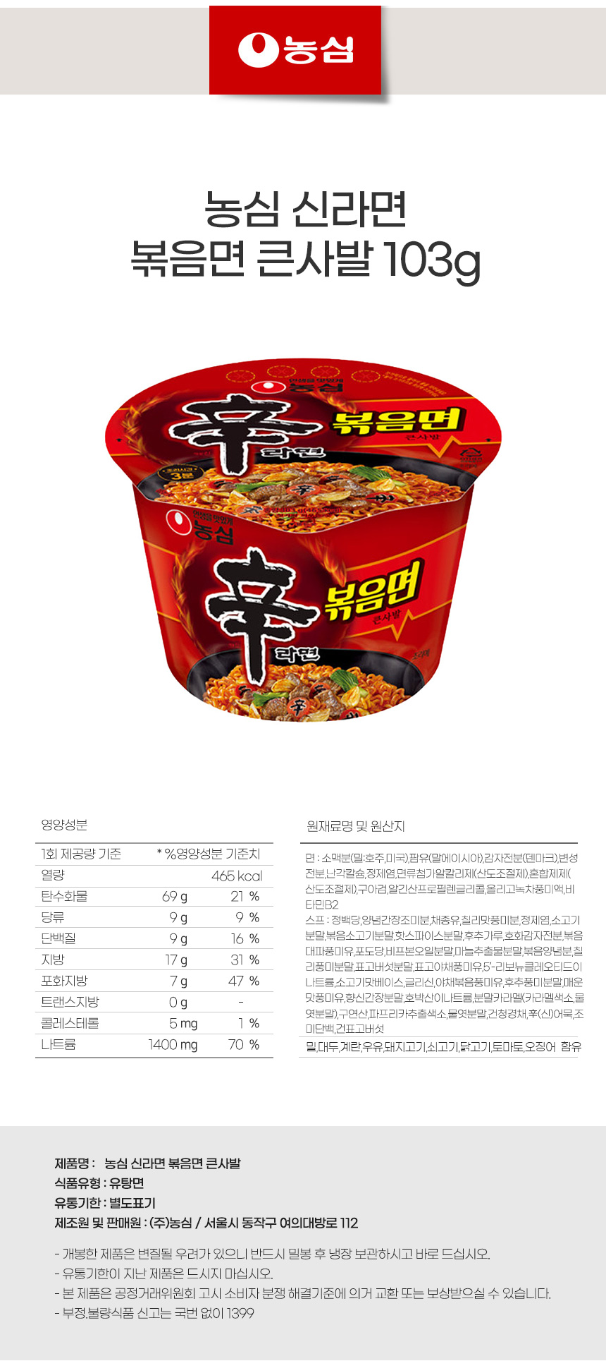 한끼라면 얼큰면 농심 신라면 볶음면 큰사발 103g상품상세_동원몰