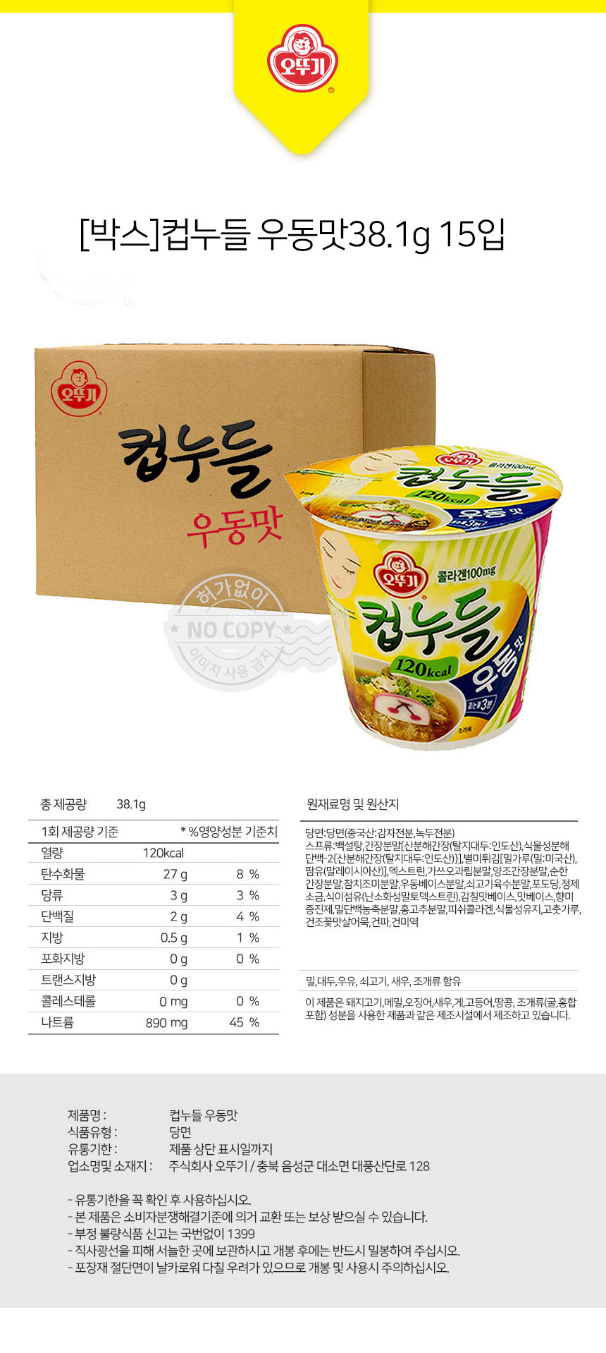 한끼라면 얼큰면 오뚜기 컵누들 우동맛 38.1g 15입상품상세_동원몰