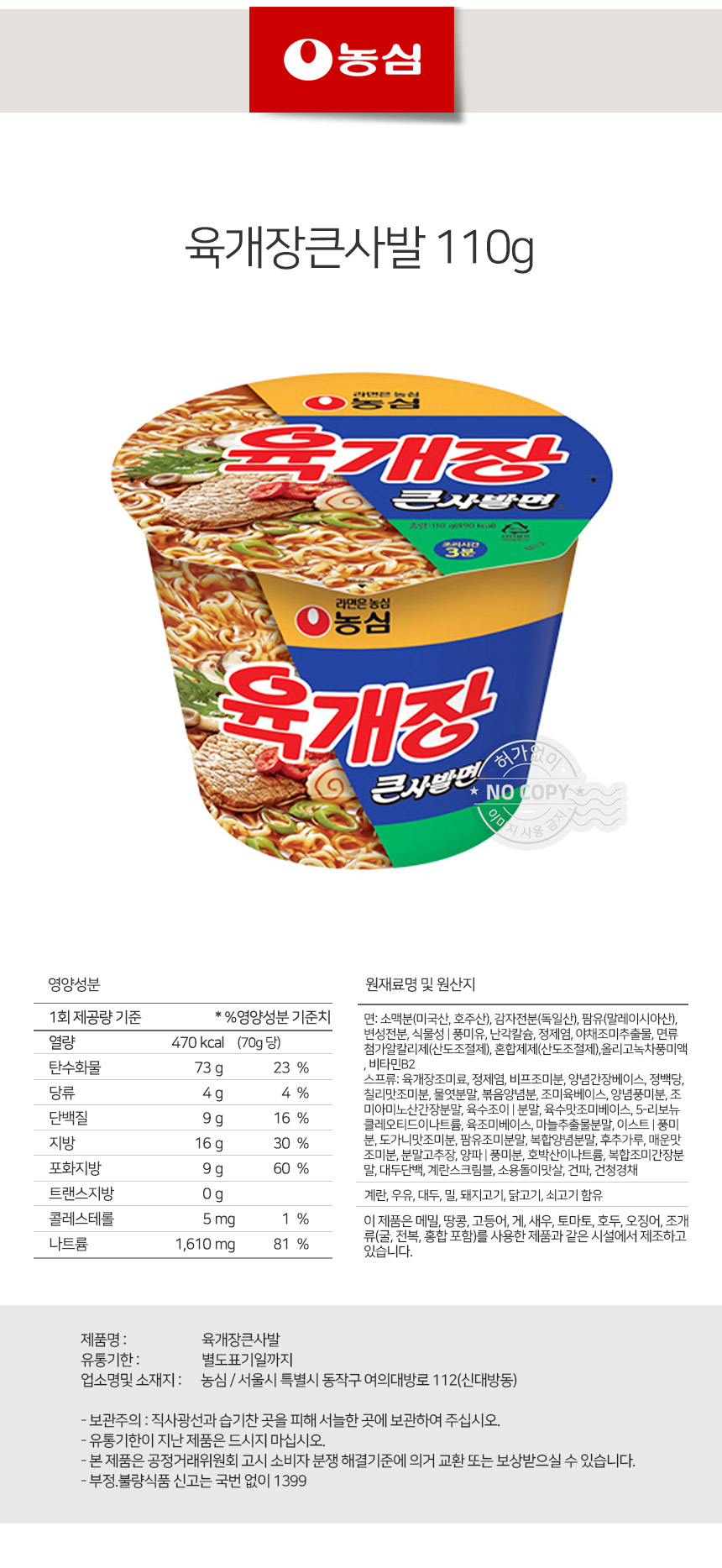 한끼라면 얼큰면 농심 육개장큰사발 110g상품상세_동원몰